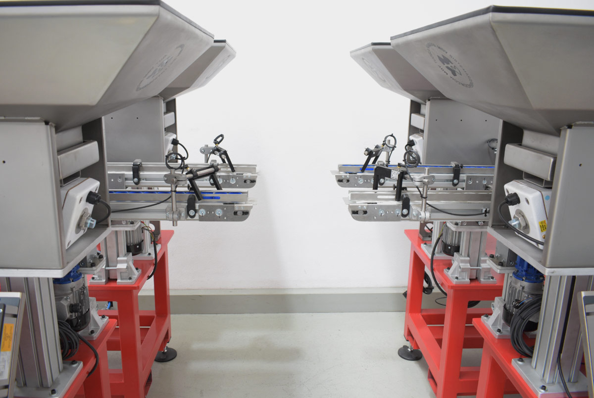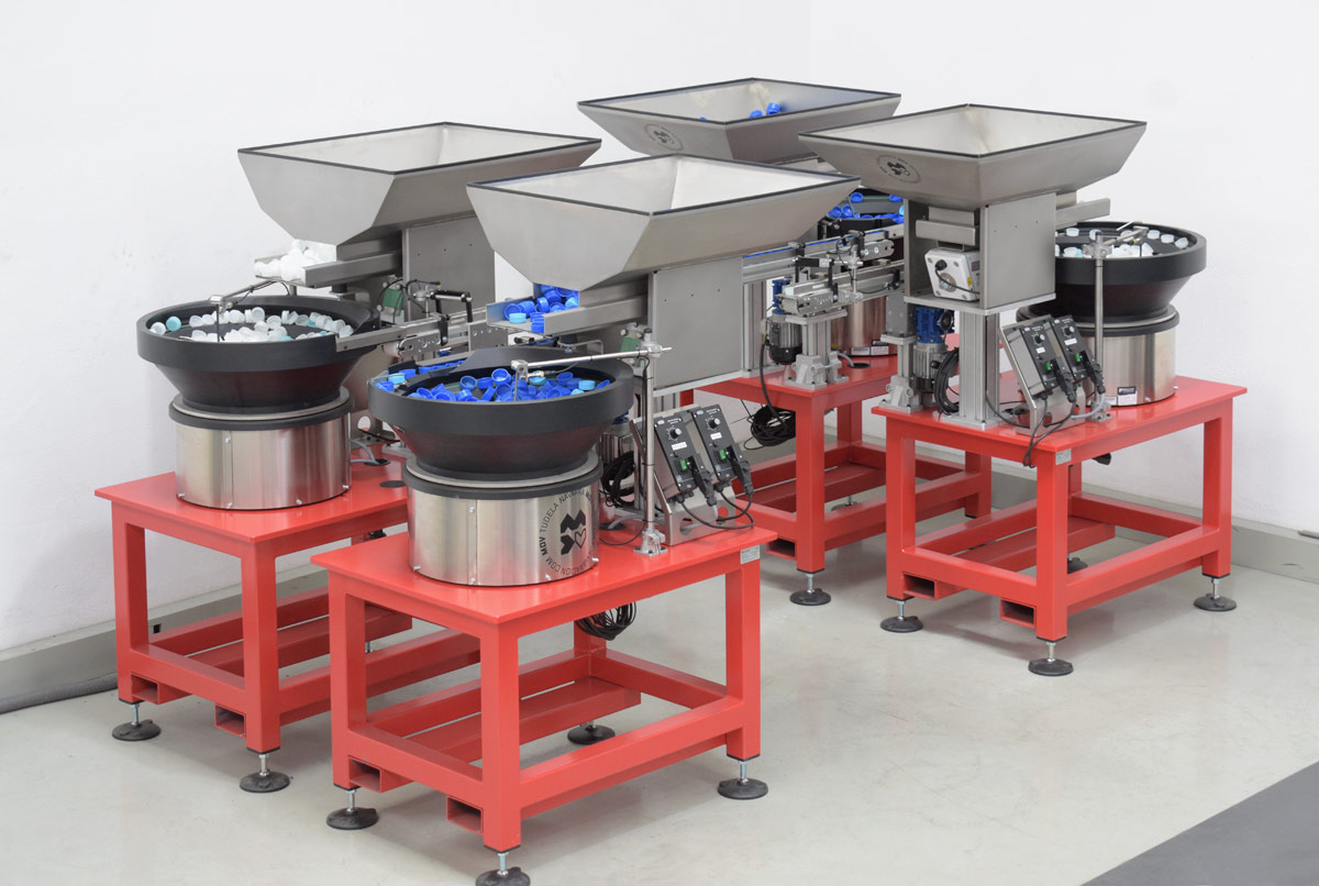 Este conjunto simétrico compuesto por 2+2 máquinas se ocupa de posicionar tapones de seguridad destinados al envasado de productos químicos.