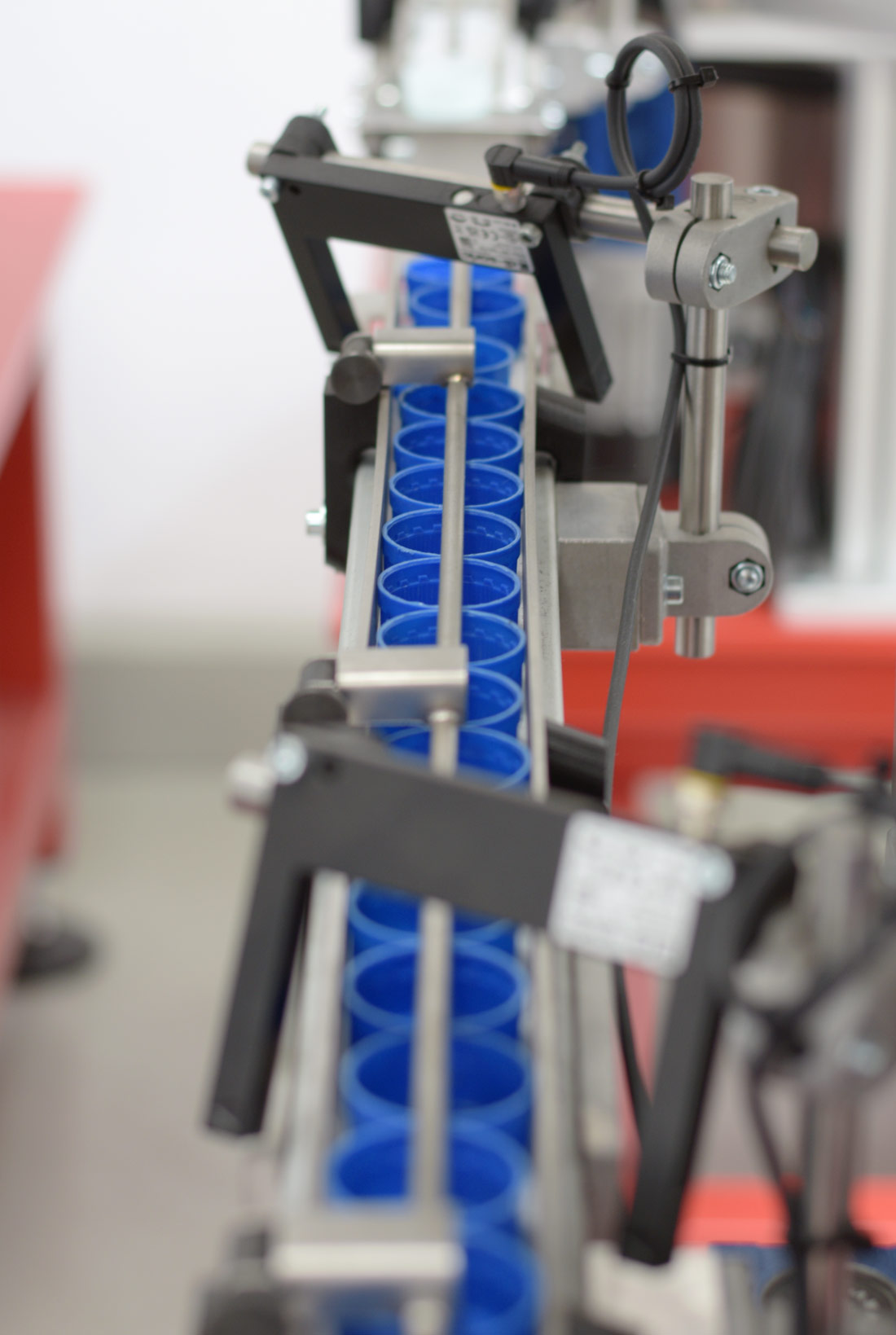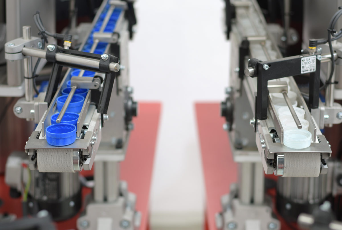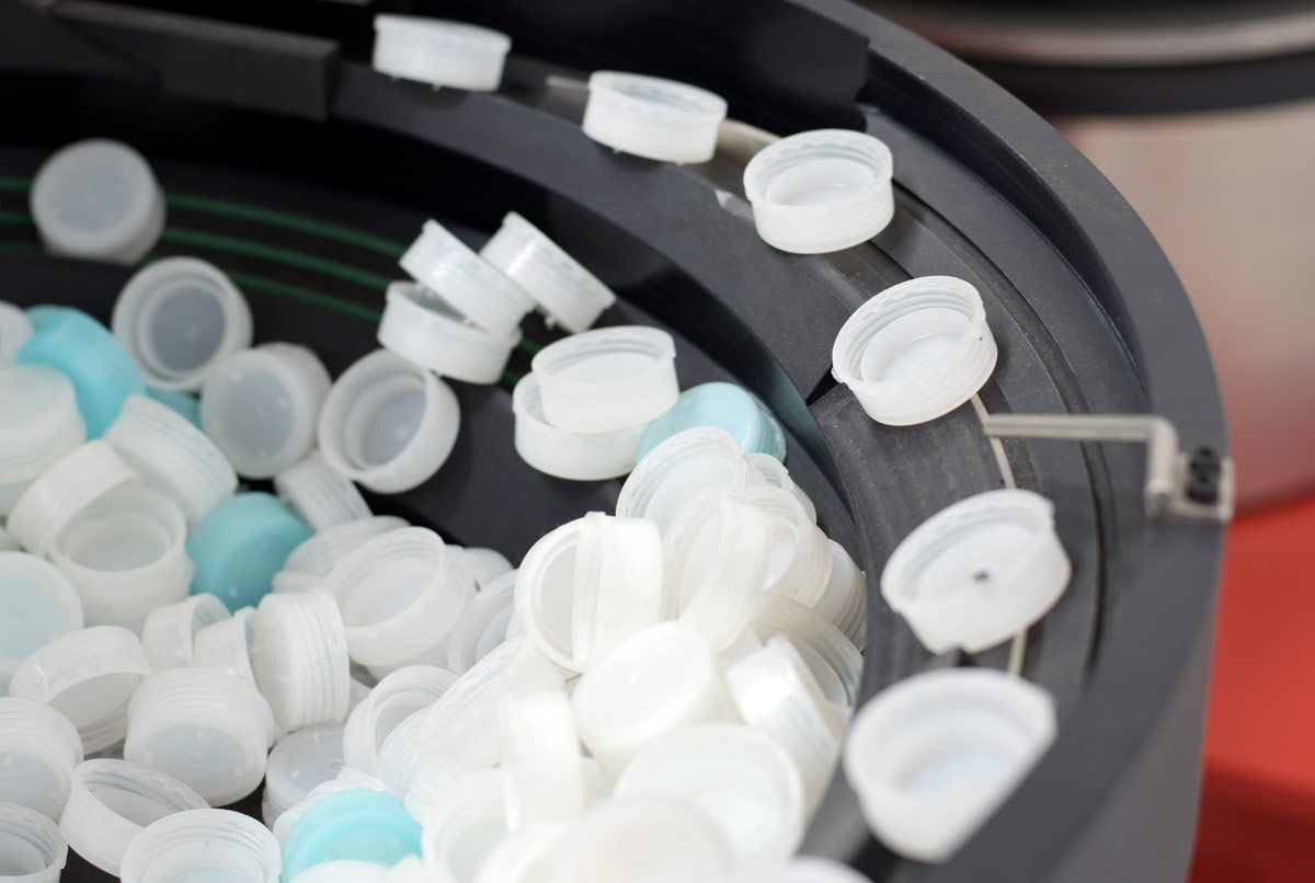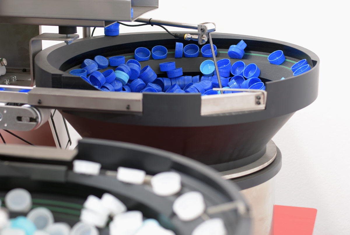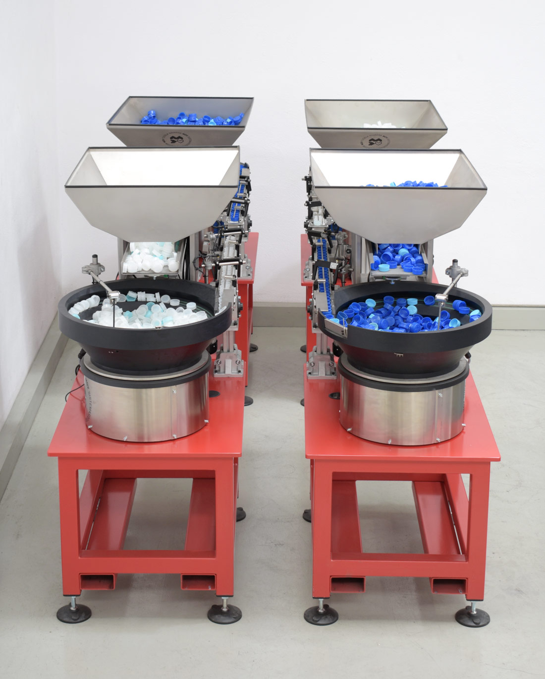 Cada tapón combina dos piezas –una exterior (azul) y otra interior (blanco)–, y ambas deben entregarse boca arriba y al mismo tiempo para su ensamblaje inmediato, en el que una ventosa captura la parte blanca y la acopla en la azul obteniendo un tapón completo.