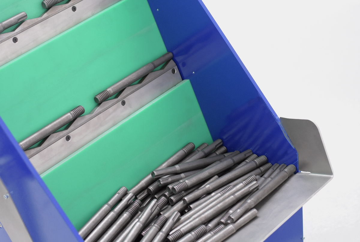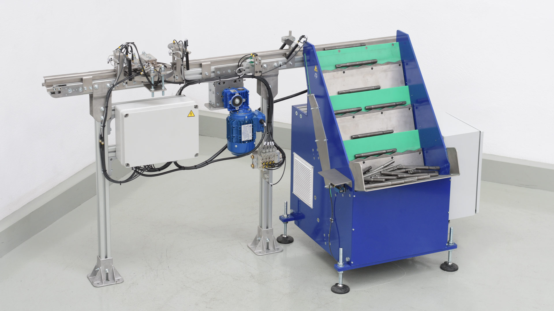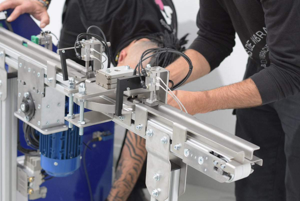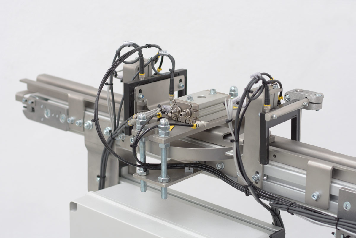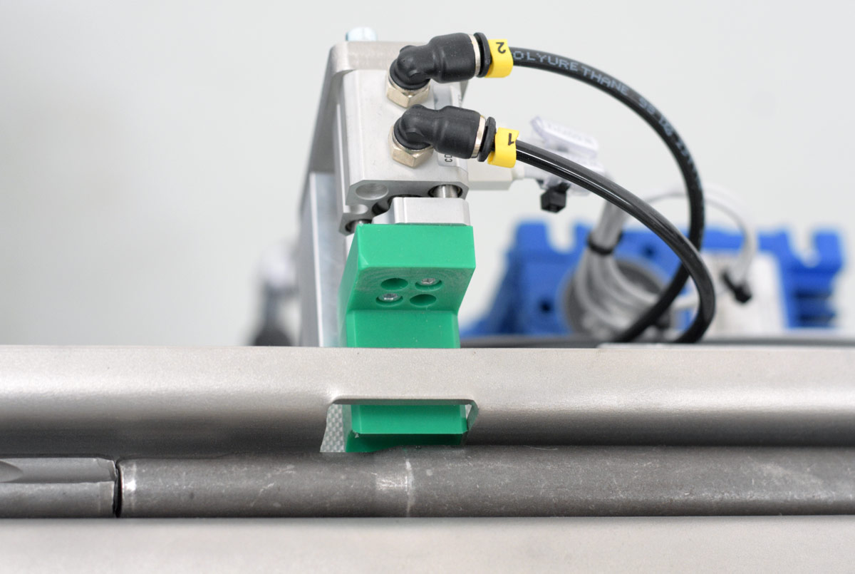 Es aquí donde echamos mano de la sensórica para comprobar que las piezas vienen en el sentido deseado. Aquellas que no presenten la rosca orientada hacia atrás, serán detectadas y los cilindros se pondrán en activo para girarlas 180º hasta su posición correcta, una solución que ha precisado de ingenio en pensamiento y ejecución.