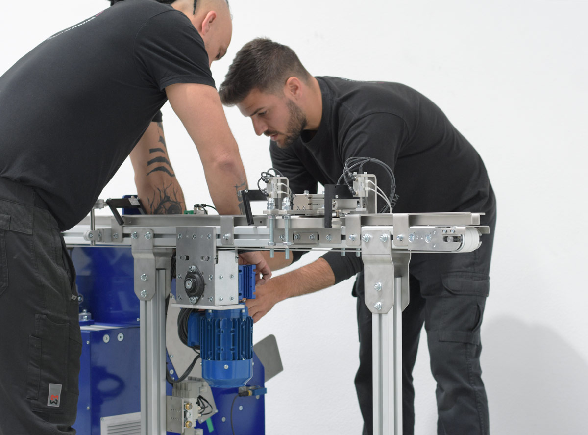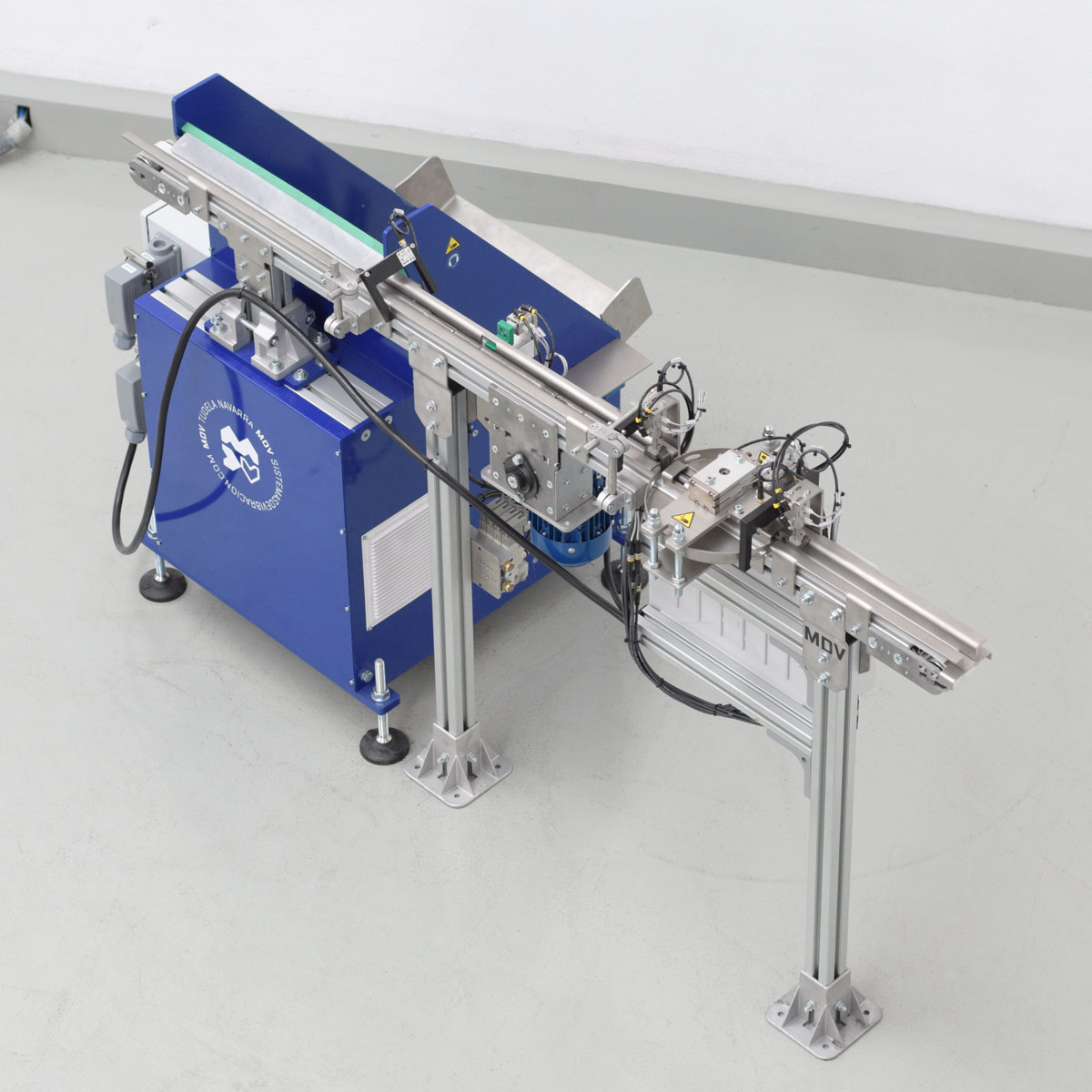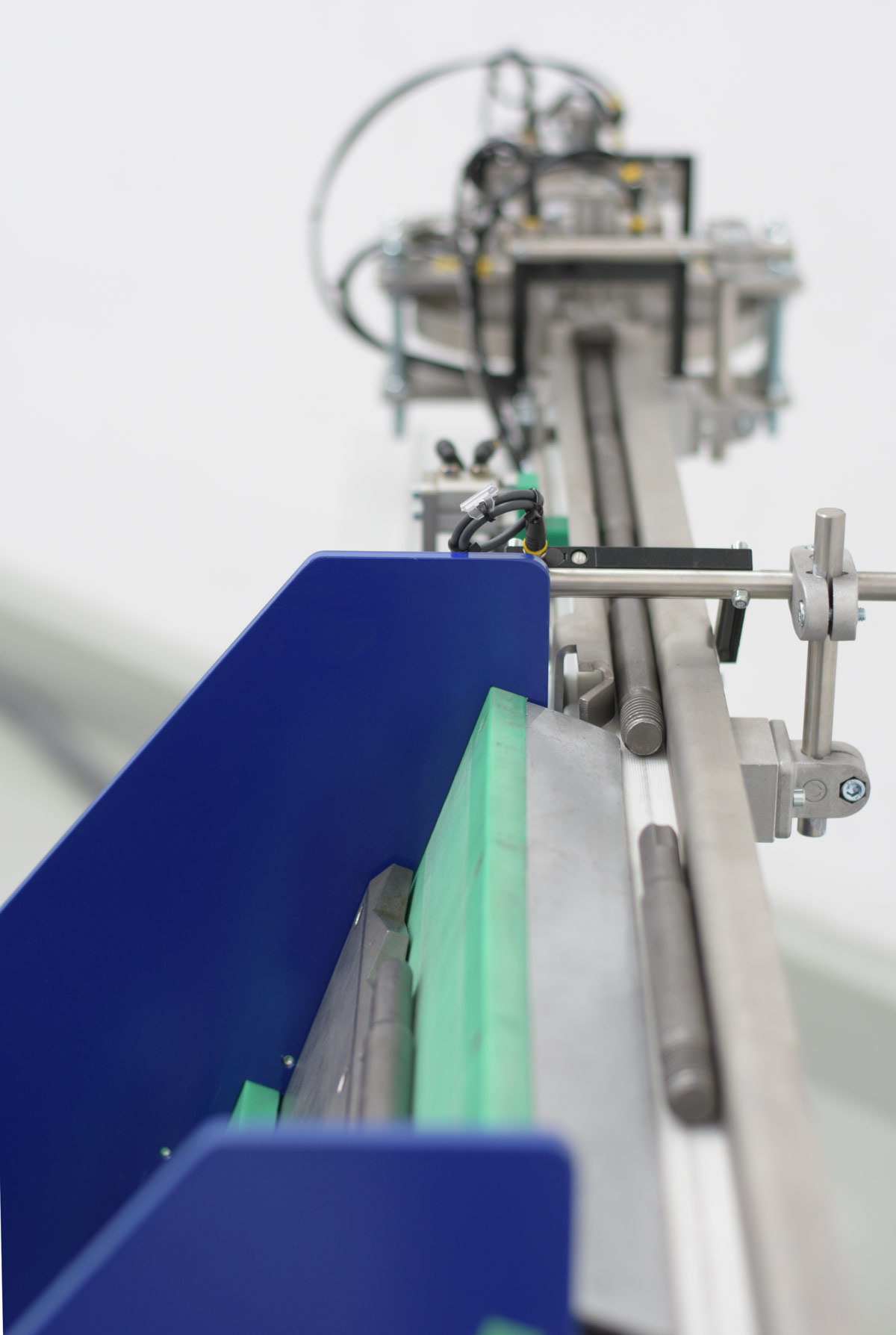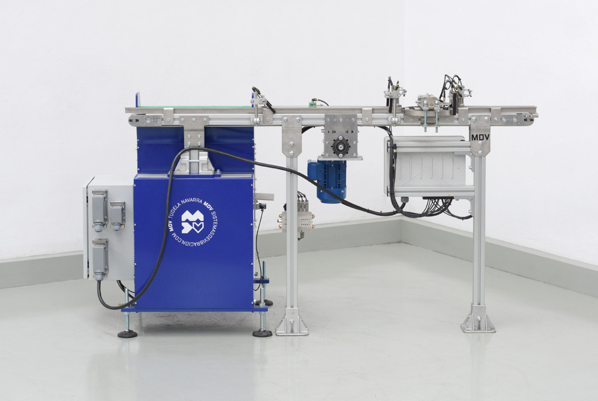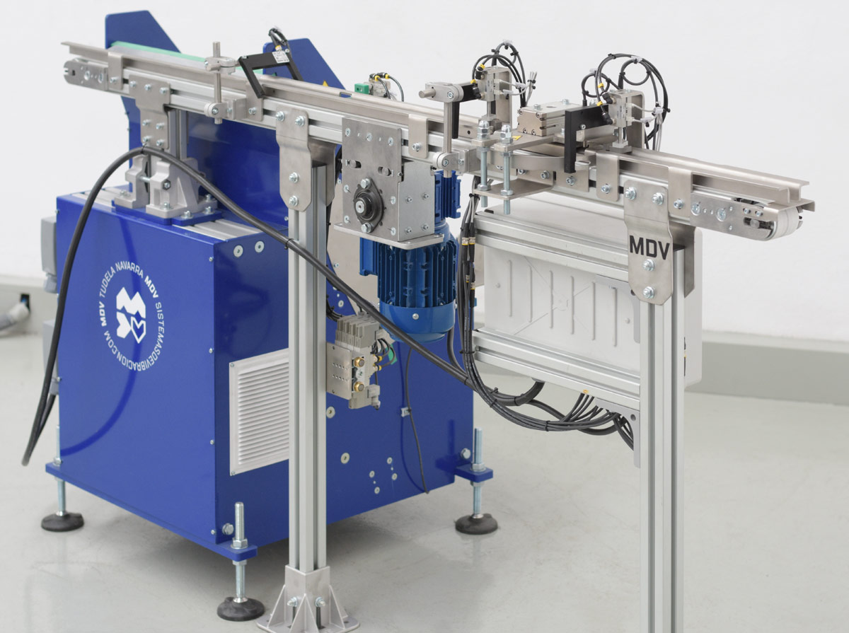 Una vez conseguida la posición tumbada de las piezas, éstas son encaminadas hacia un paso a paso incorporado en la propia cinta transportadora.