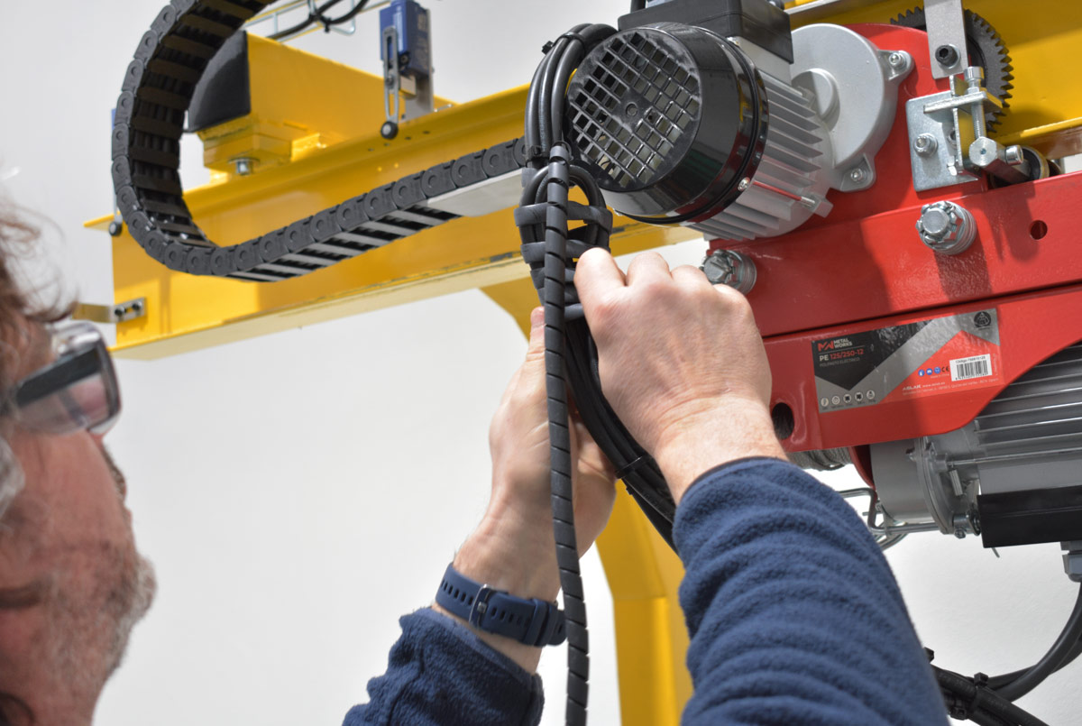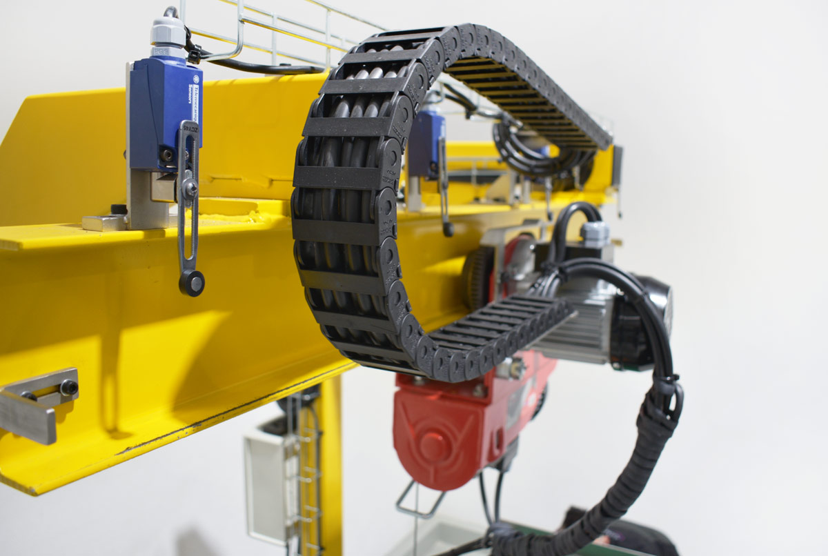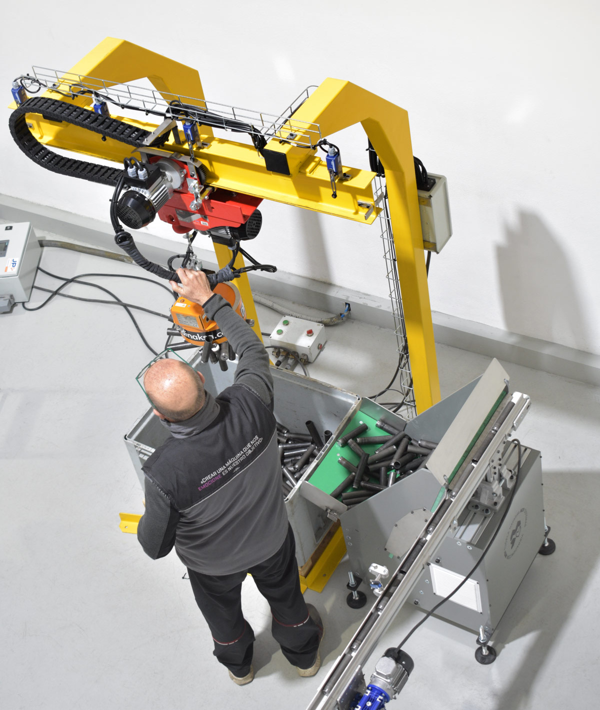 Conscientes de esto, nuestra solución pasó por diseñar y fabricar un polipasto de autonomía provisto de electroimán con 3 posiciones de recogida de piezas directamente desde el contenedor para ser depositadas en la tolva del elevador de lamas.