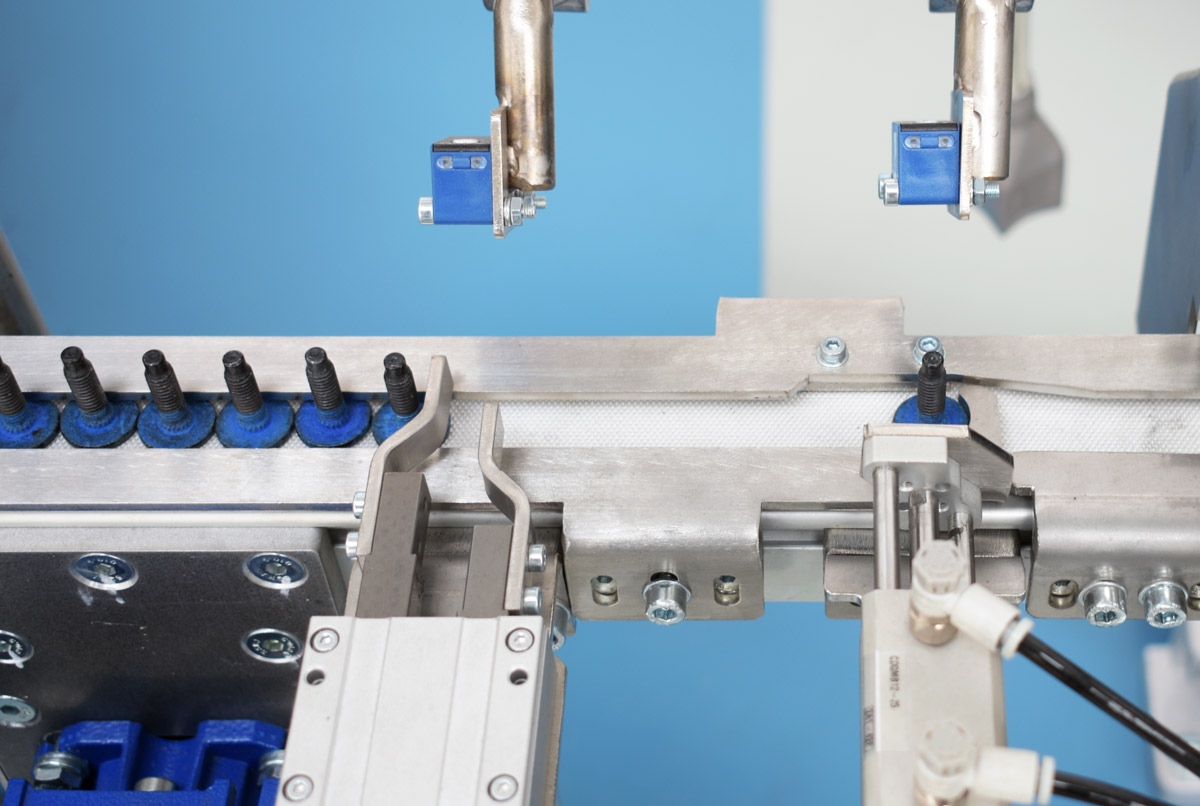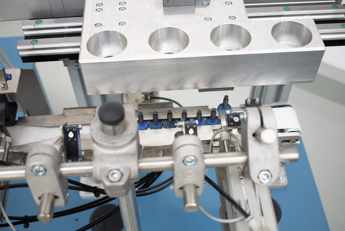 En el extremo de la cinta transportadora los tornillos descubren la cuna y experimentan un movimiento hacia el interior de la cámara de soplado. Este punto permite regular el umbral de acumulación de piezas.