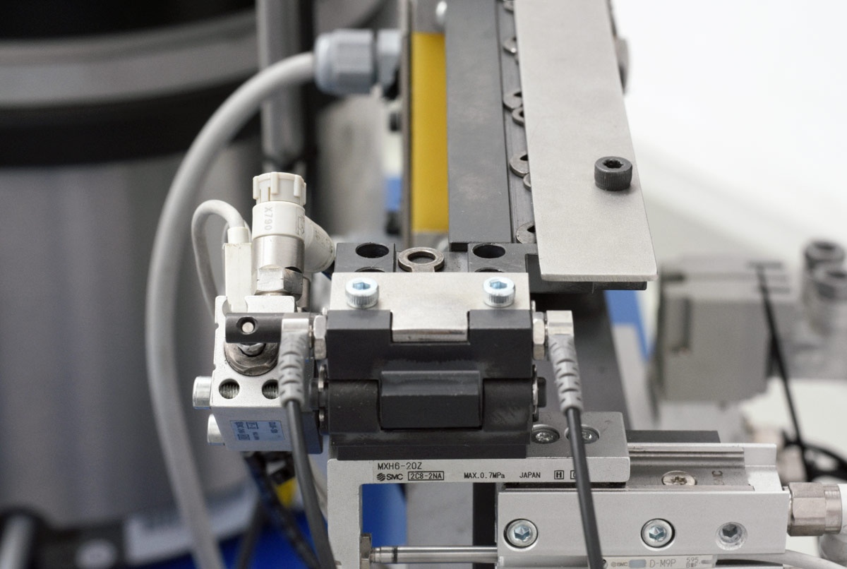 La misión del primer paso a paso es que, cuando las piezas entran 1 por 1 en la cuna de recogida, un cilindro neumático guiado la desplaza lateralmente para dejarla aislada.