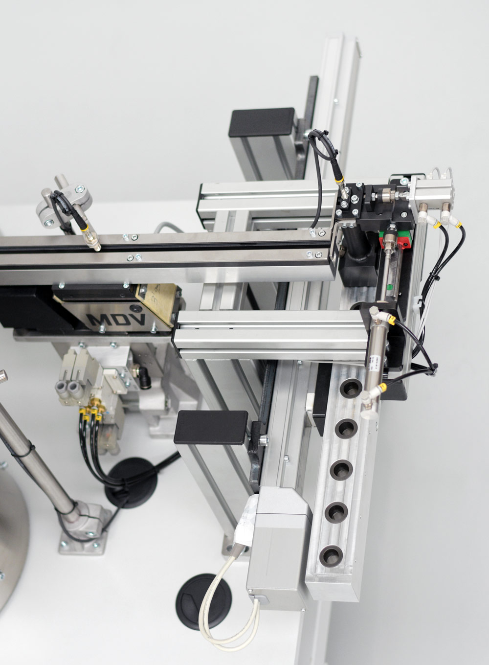 El primer paso a paso recoge los tornillos del lineal y los desplaza lateralmente, uno a uno, para dejarlos caer por un conducto. Bajo dicho conducto se encuentra el segundo paso a paso con 10 estaciones, cada una de ellas se sirve de su correspondiente tubo de extracción por el que son lanzados los tornillos, mediante un soplido, hasta el punto de entrega situado a más de 2 metros de distancia.