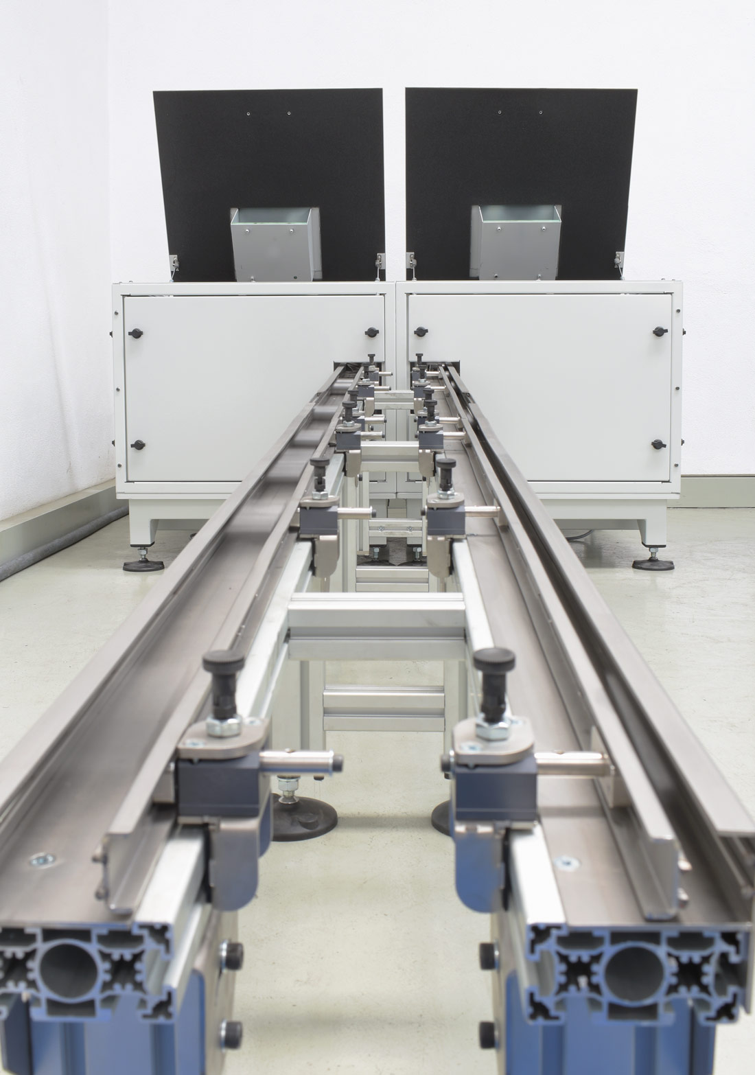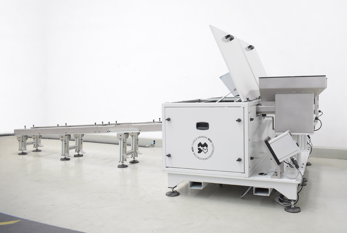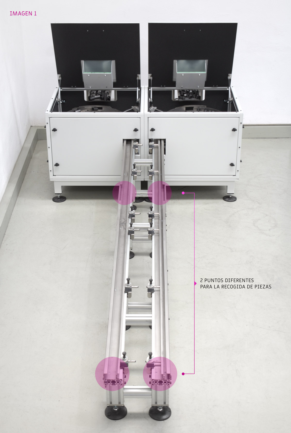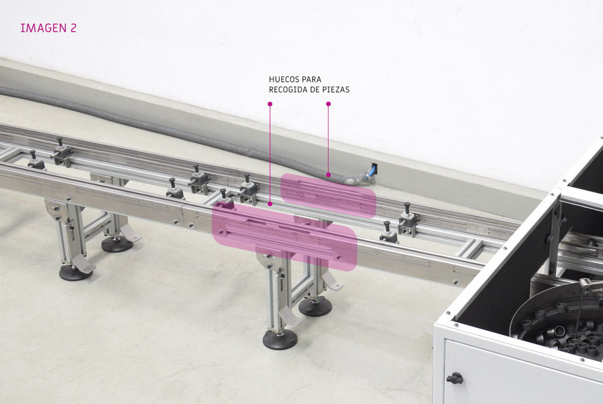 «Un solo sistema, tres referencias de piezas y apenas unos ajustes sencillos para cambiar entre ellas». Este es el encabezamiento del proyecto y que derivamos en dos máquinas simétricas unidas que vienen aprovisionadas con dos rampas de salida de casi tres metros y con doble punto de recogida identificado [ver imágenes 1 y 2].