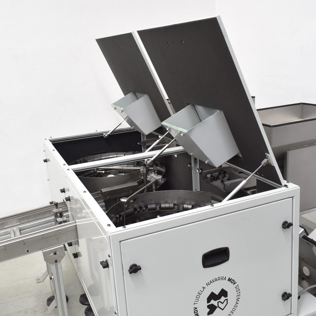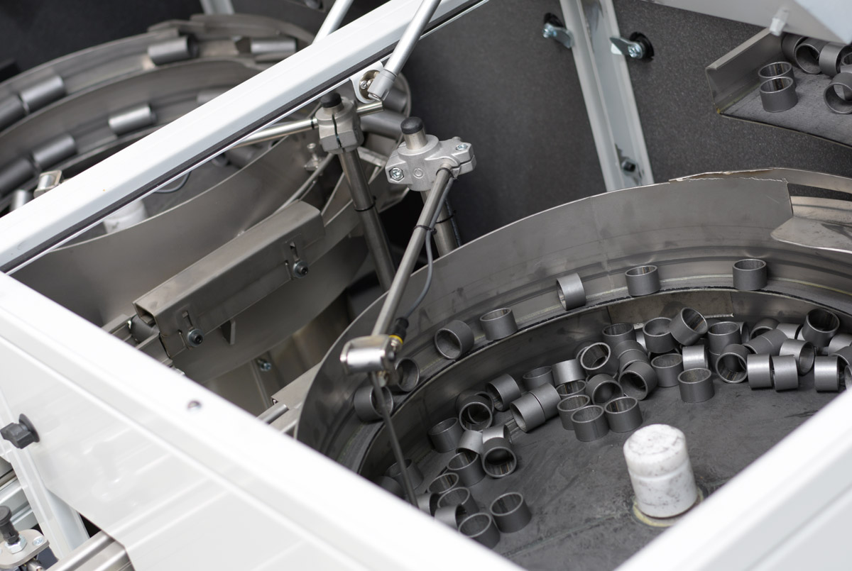 Cada uno de estos dos posicionadores cuenta con su propia tolva de autonomía de 30 litros, una cuba fabricada en acero inoxidable, un vibrador circular y su correspondiente rampa de caída de piezas. Por cierto, las piezas a posicionar son tres modelos de casquillos.