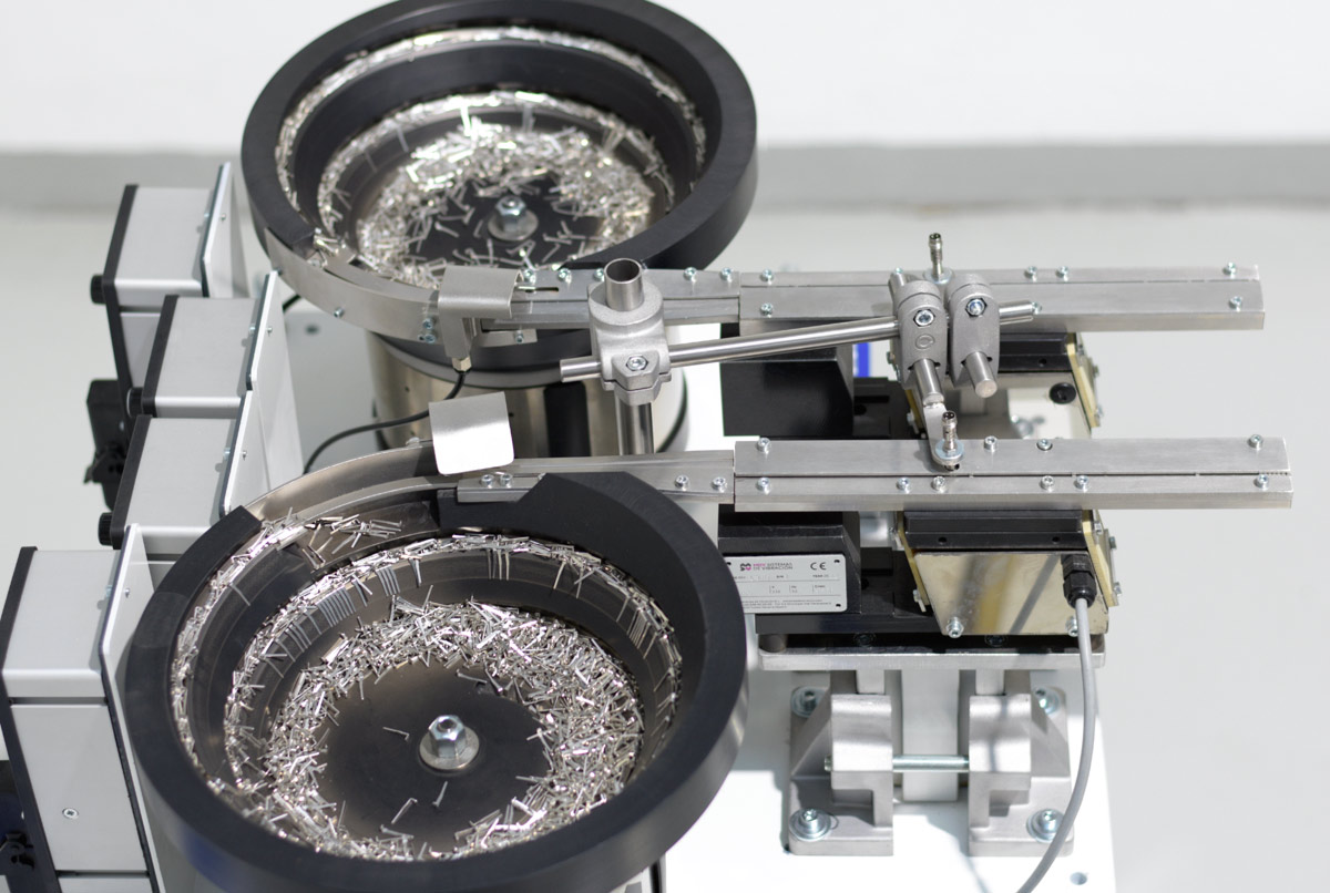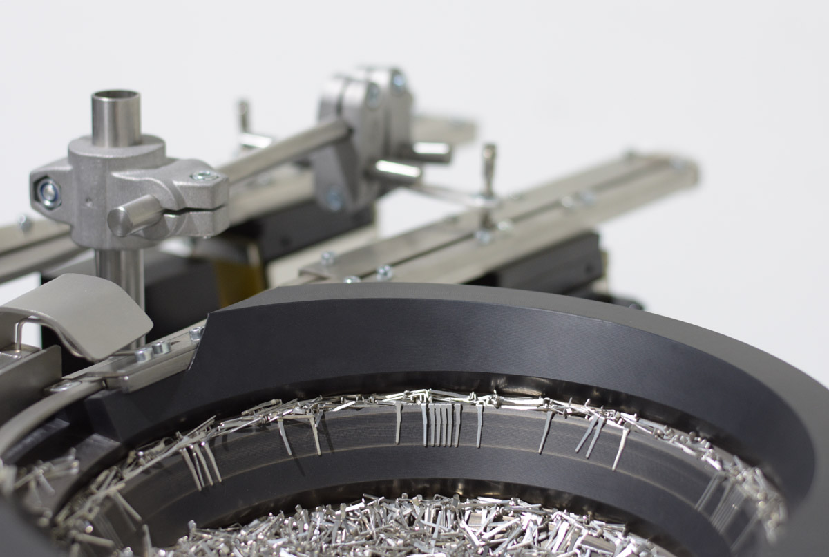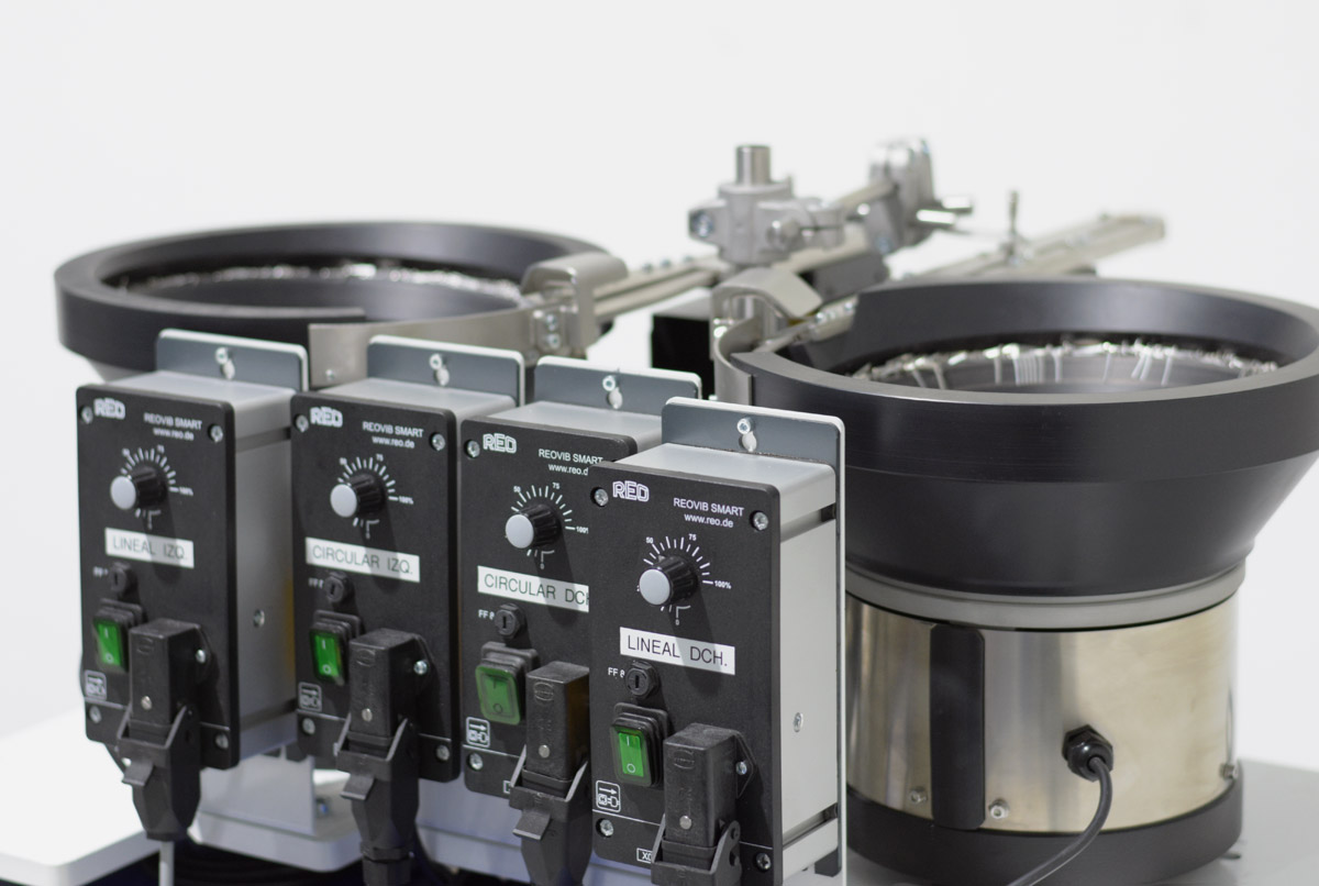Lo mejor que les puede ocurrir a este tipo de piezas es que las tolvas vibratorias que las posicionan estén fabricadas en fibra de vidrio y no en chapa. El ‘juego’ y versatilidad que nos presta este material es incomparable a la hora de mecanizar la cuba de acuerdo a las características geométricas de estos pequeños terminales metálicos. Es así cómo tenemos un mayor control de la posición y la cadencia de salida.