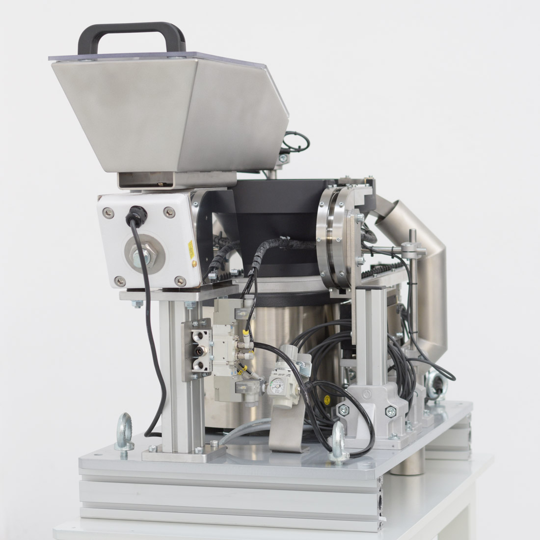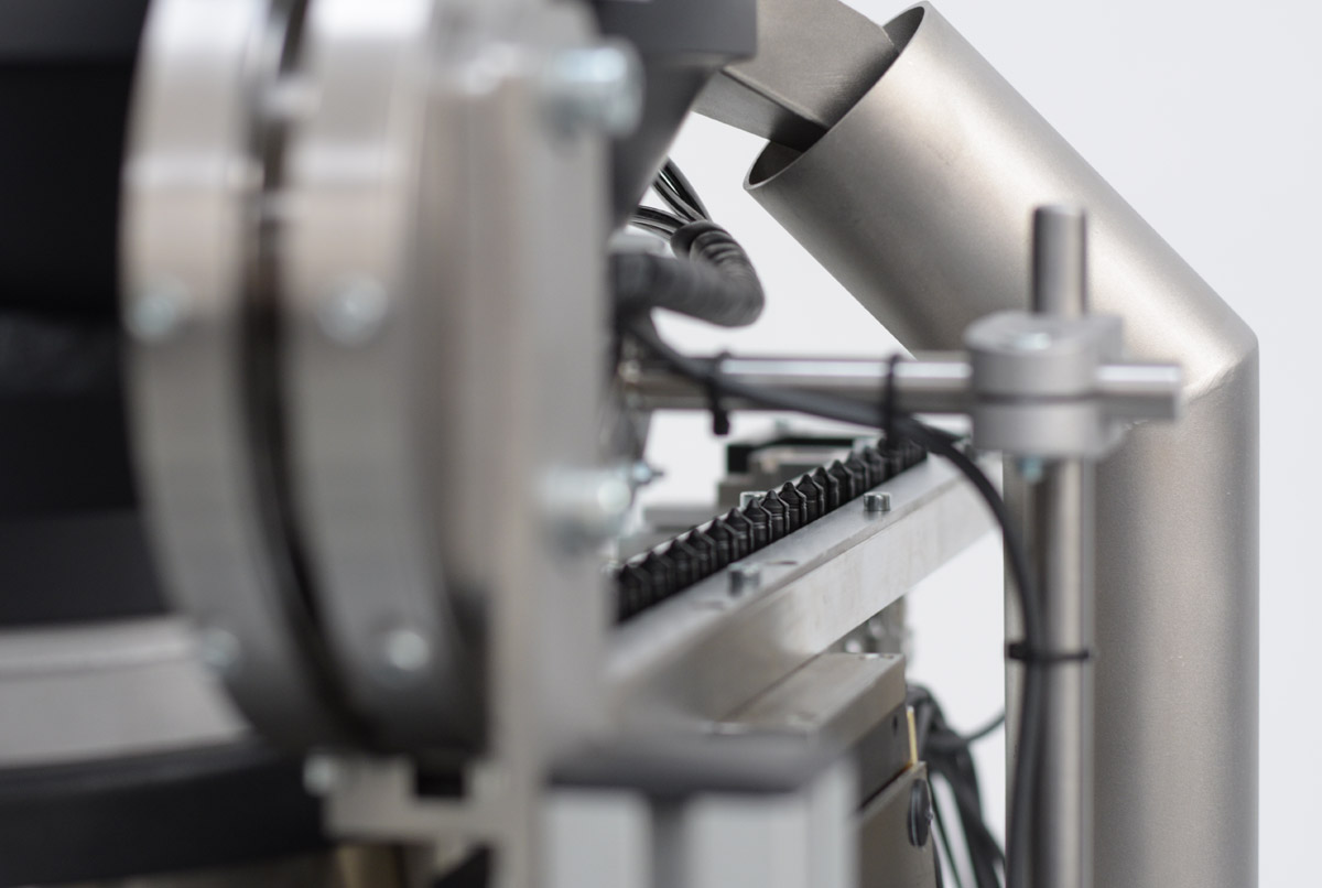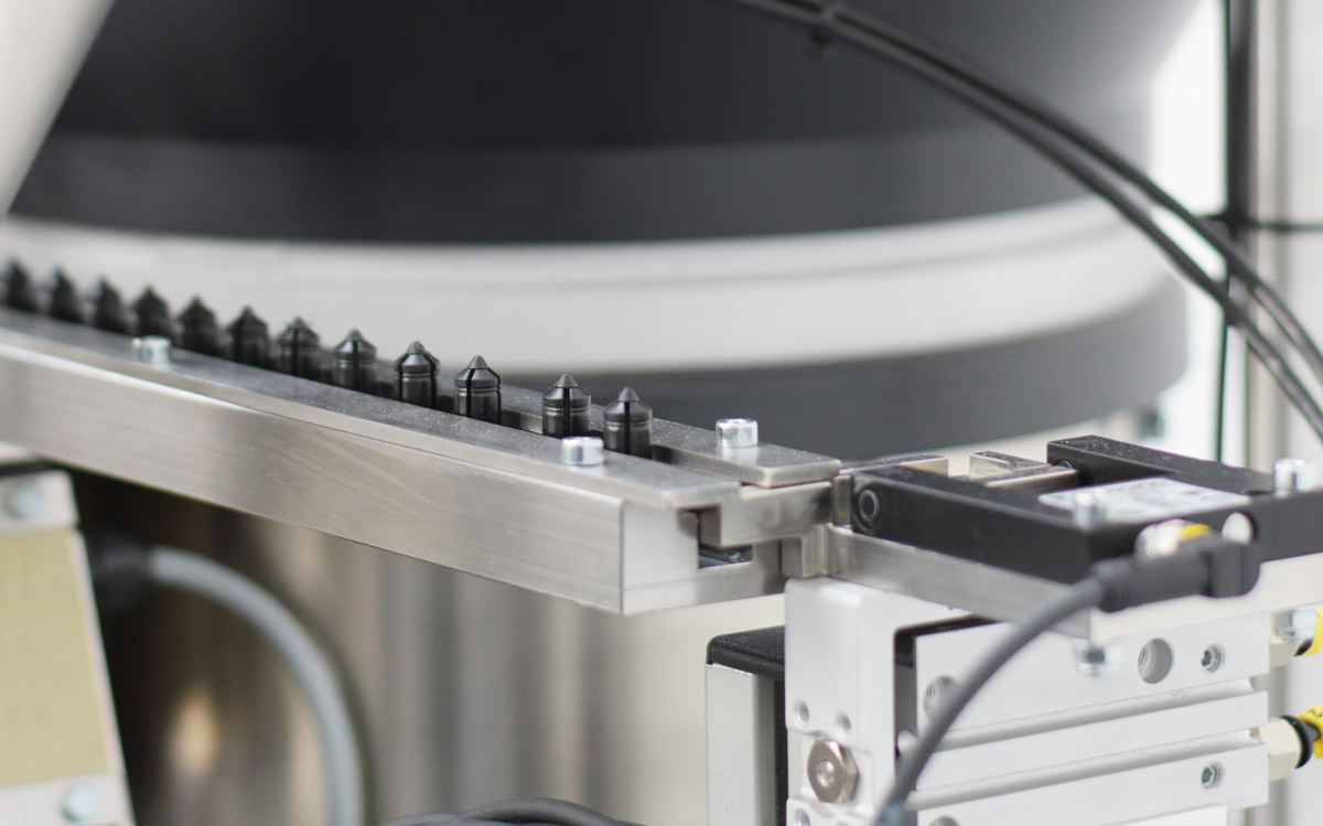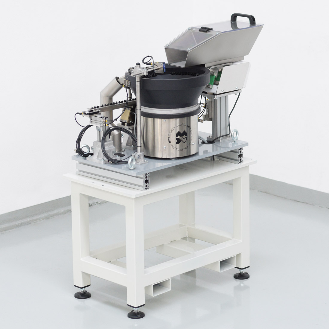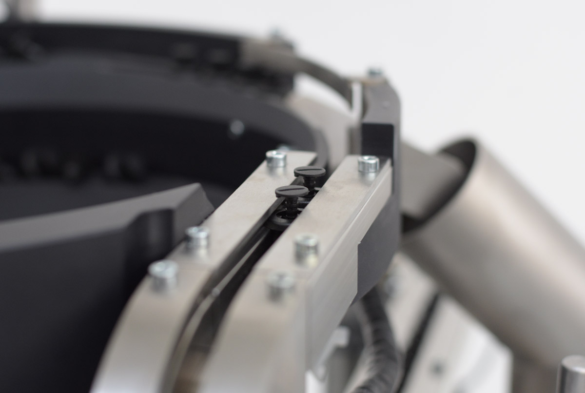 El resto de piezas caen por efecto de la gravedad, en una caída libre semicircular, que nos permite girarlas 180 grados. El cilindro de la cuna de recogida las posiciona transversalmente para poder ser abastecidas a la mano del robot que continuará el proceso de la cadena de producción industrial.