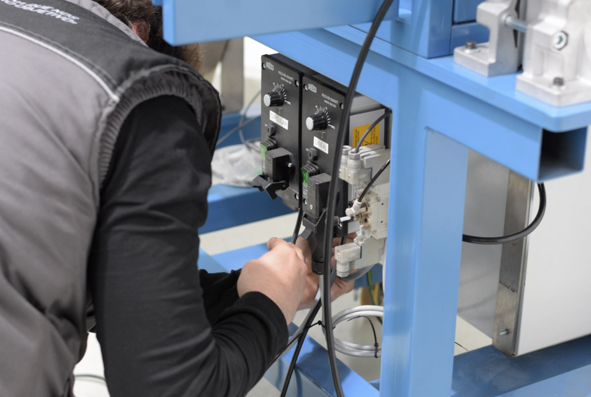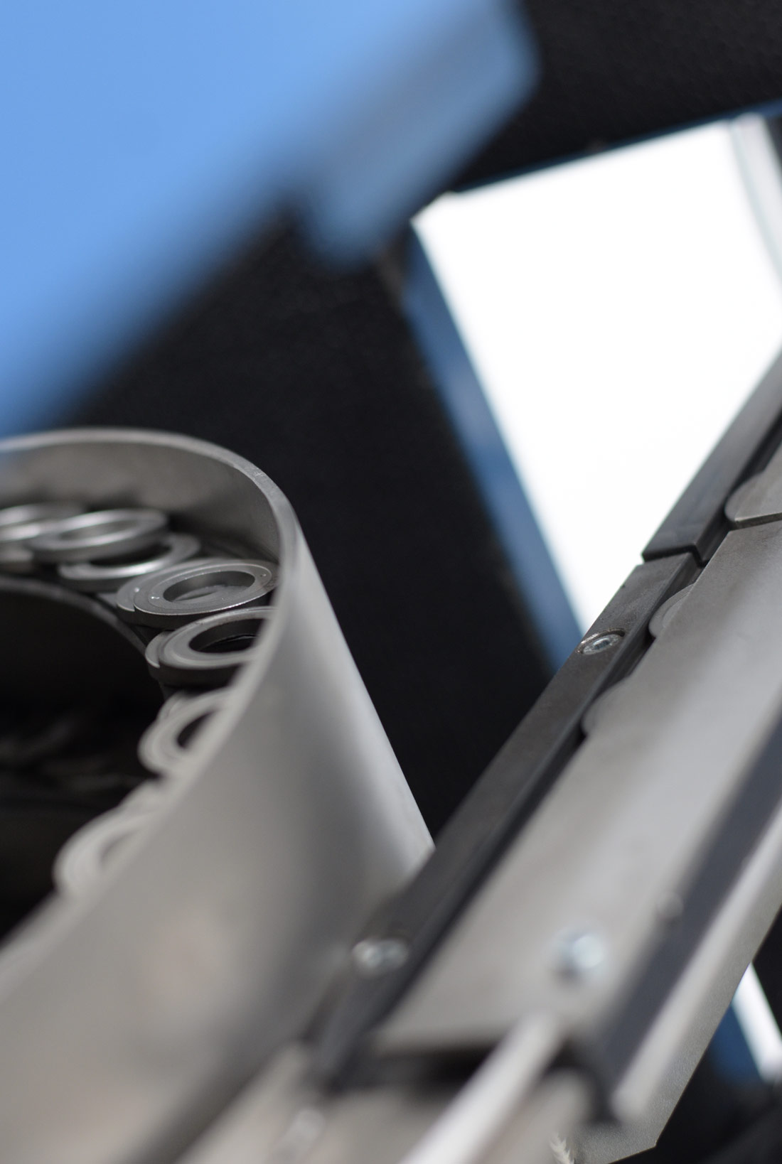 Las piezas ascienden por la cinta transportadora elevadora hasta desembocar en la cuba circular de acero donde, por efecto de la vibración, son orientadas en la posición demandada para, acto seguido, hacer su salida a través de un vibrador lineal fabricado en nuestra casa.