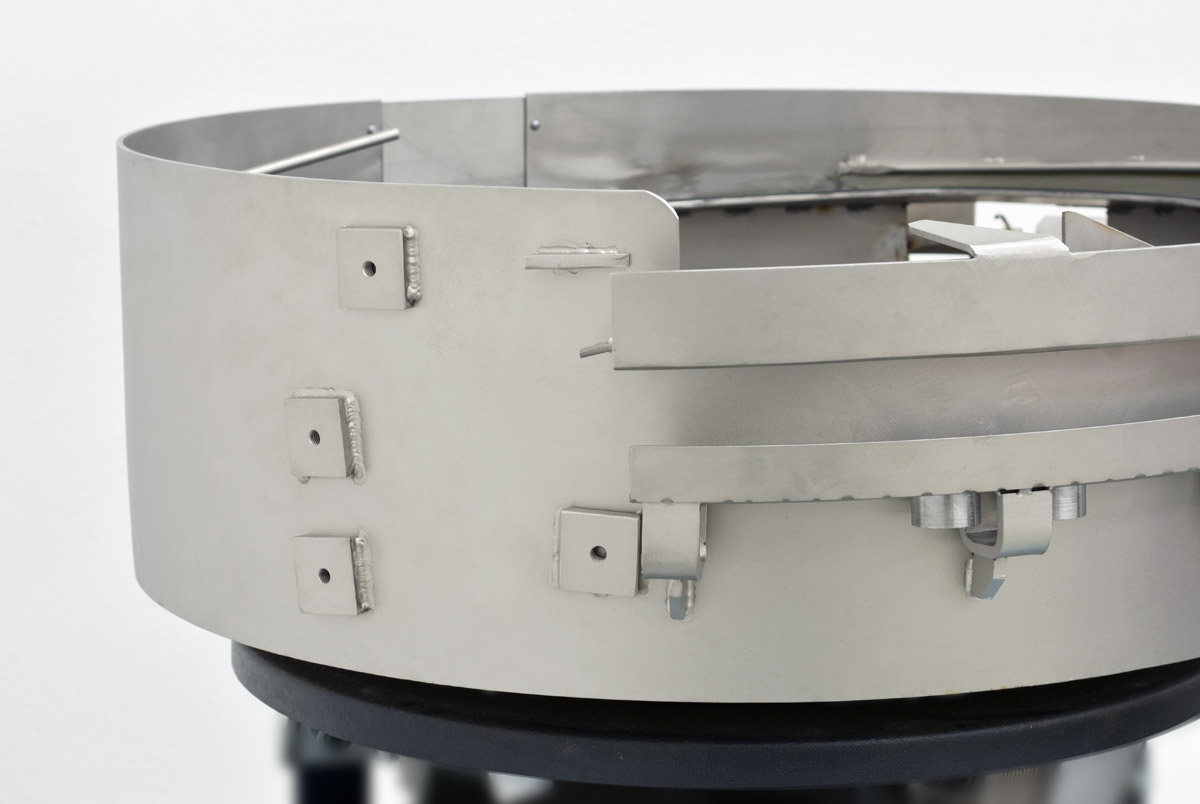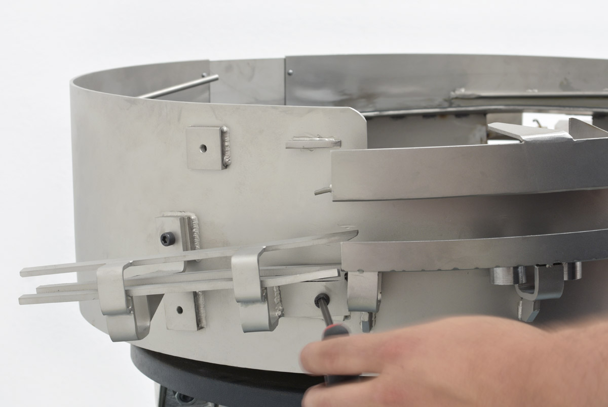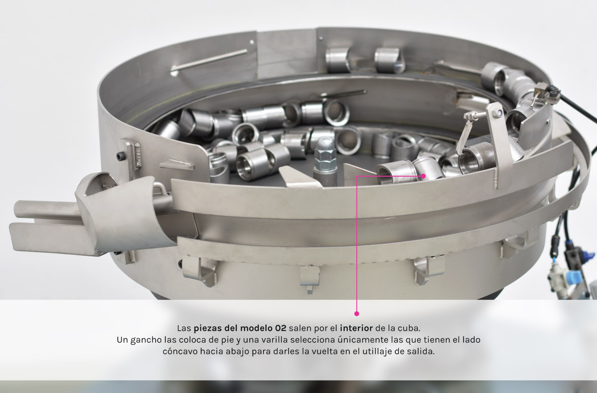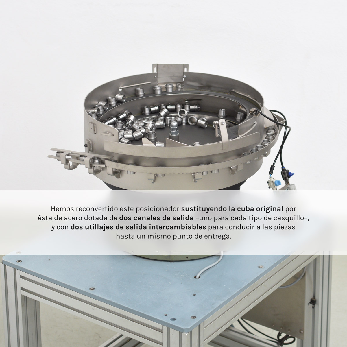 Fabricado en sus inicios con cuba de fibra y para un tipo de pieza, llegó un momento en el que este posicionador vibratorio debía satisfacer otros requerimientos y afrontar una nueva etapa. Y en esa ‘actualización’ entramos nosotros, adaptándolo y ajustándolo para que pudiera responder a su nueva función: posicionar 2 tipos de casquillos, distintos a aquella pieza inicial, y, también, distintos entre sí.