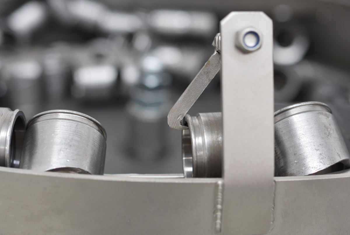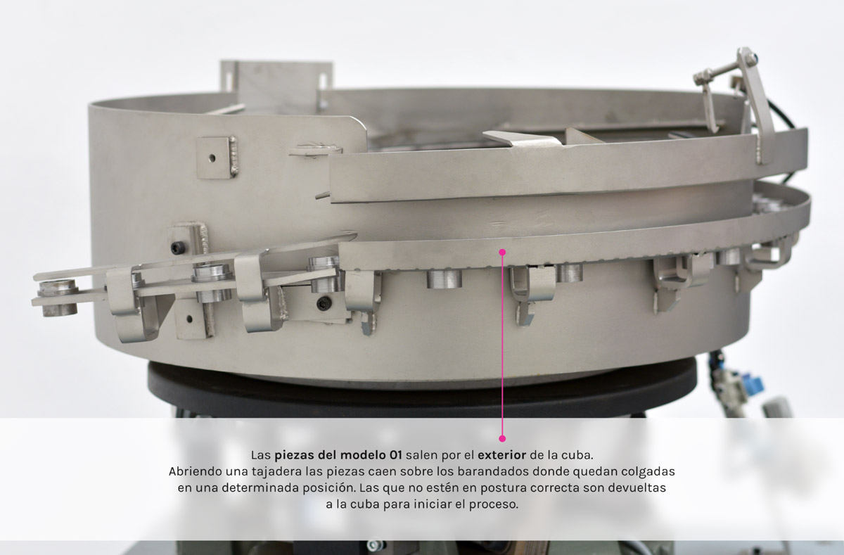 Le proporcionamos 2 salidas a la cuba, una interior y otra exterior, y 2 utillajes de salida independientes e intercambiables que consiguen dirigir las piezas hasta un mismo punto de entrega.