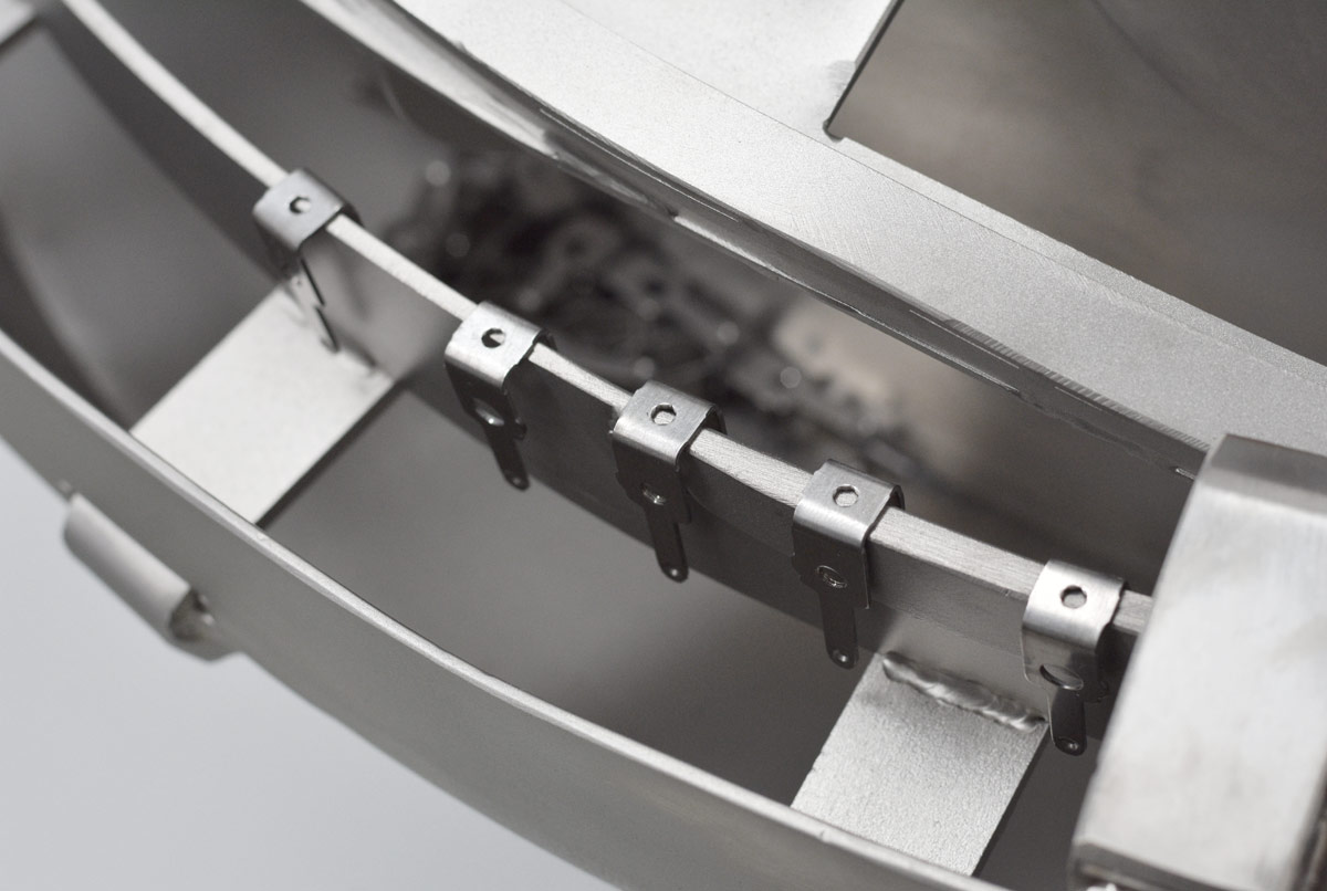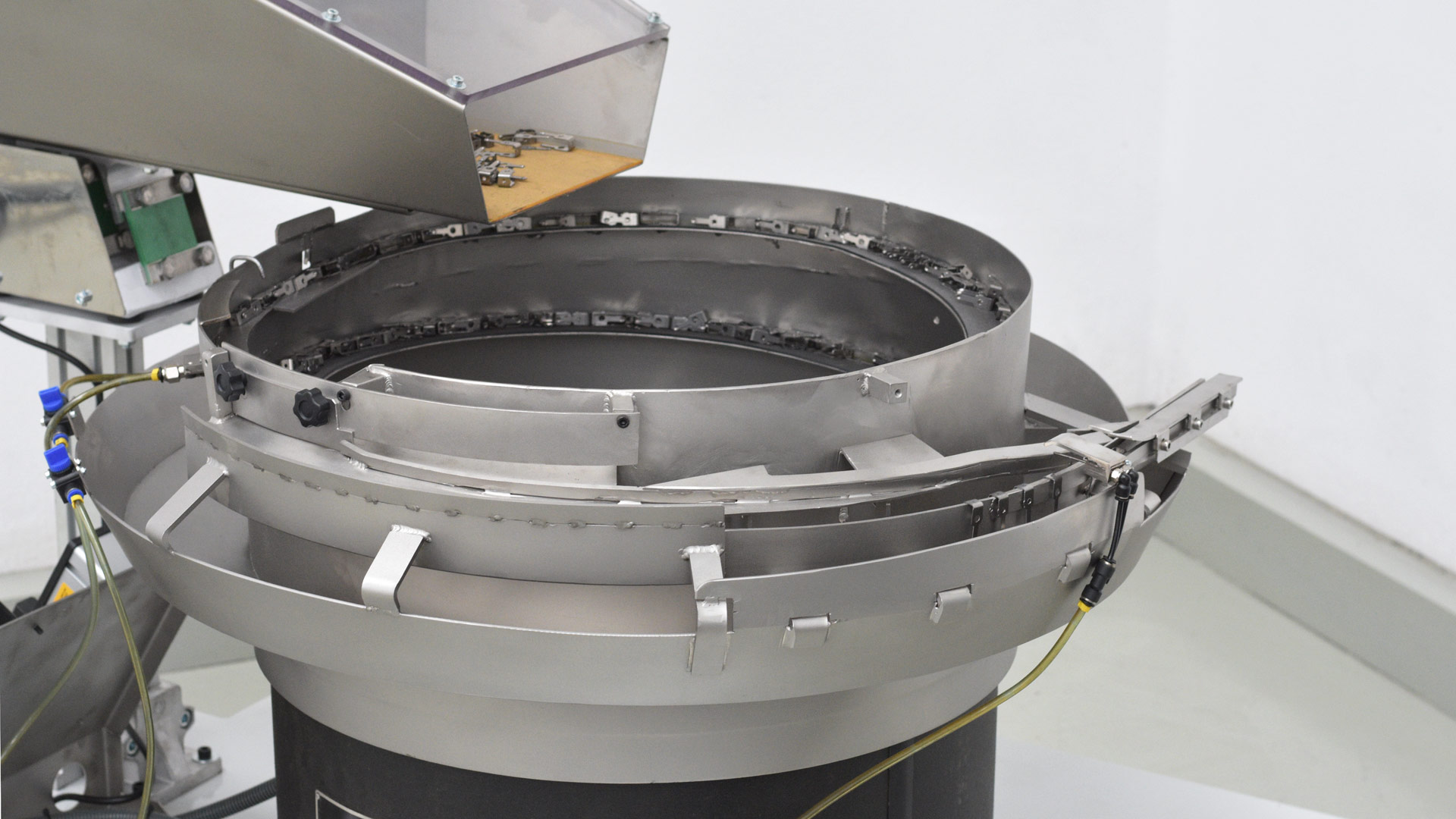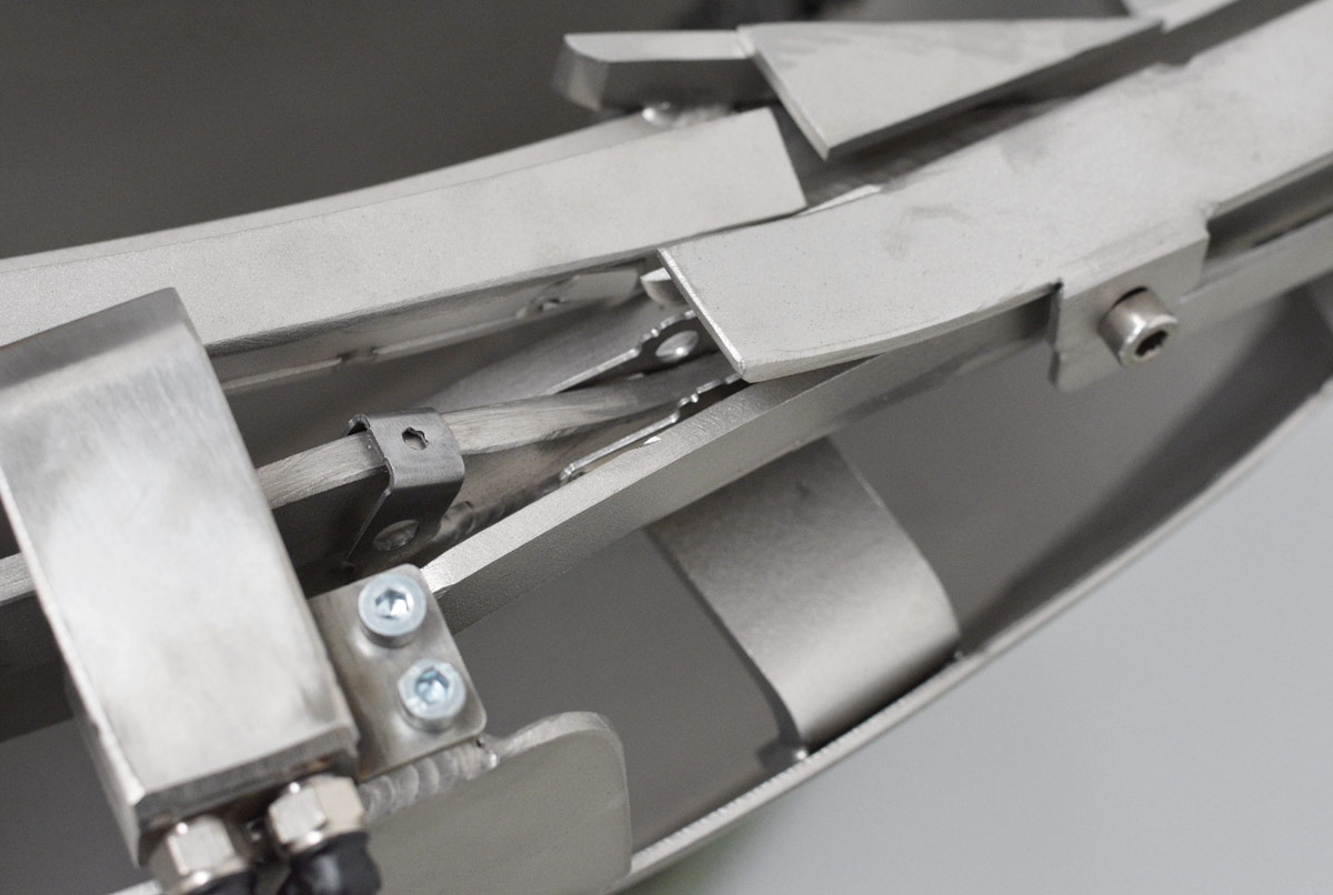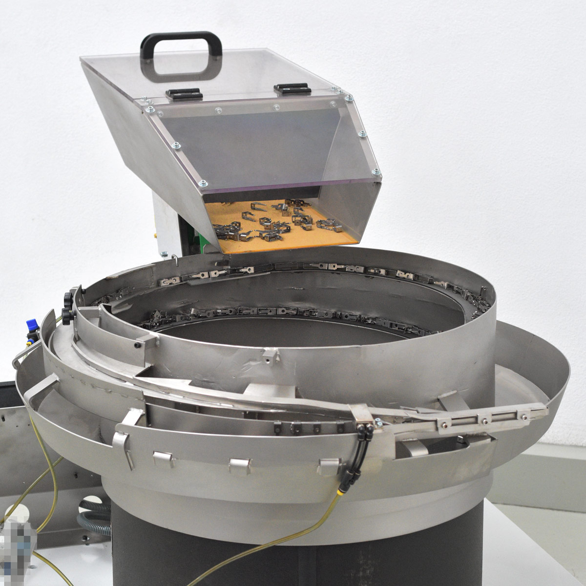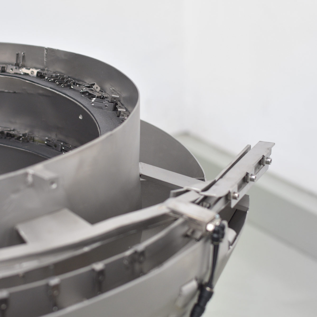 La máquina pertenece a un fabricante de muelles, como estos, denominados flejes. Tras abandonar la unidad de plegado, los flejes necesitan ser supervisados para asegurar su correcta fabricación. En este proceso de control de calidad, las piezas deben entrar en el plato de visión bajo varias premisas: de una en una, separadas y en posición horizontal; se trata de que la cámara de visión pueda hacer capturas y determinar si cada pieza está en condición óptima o defectuosa.