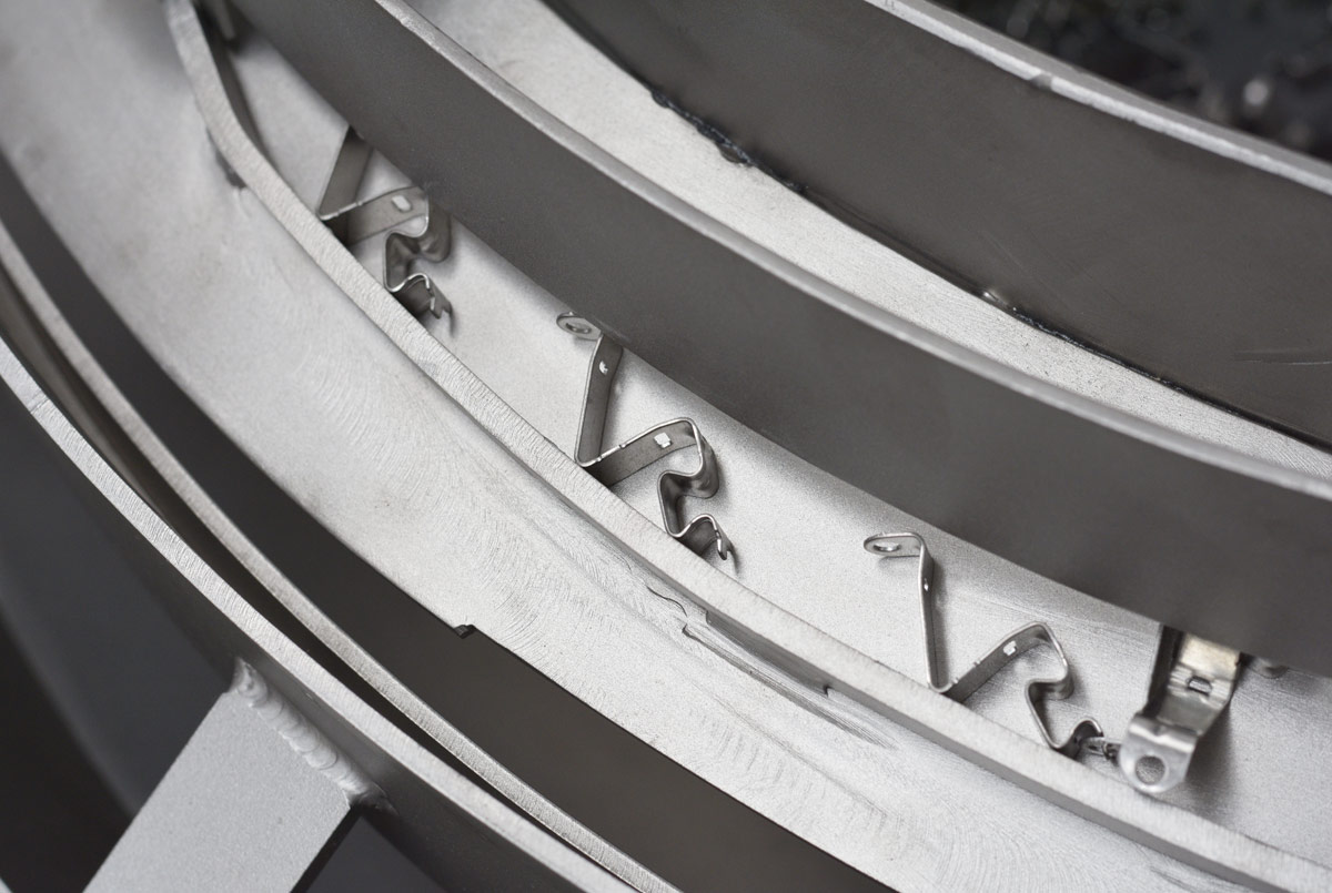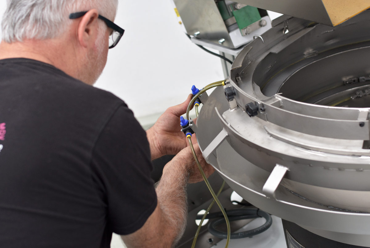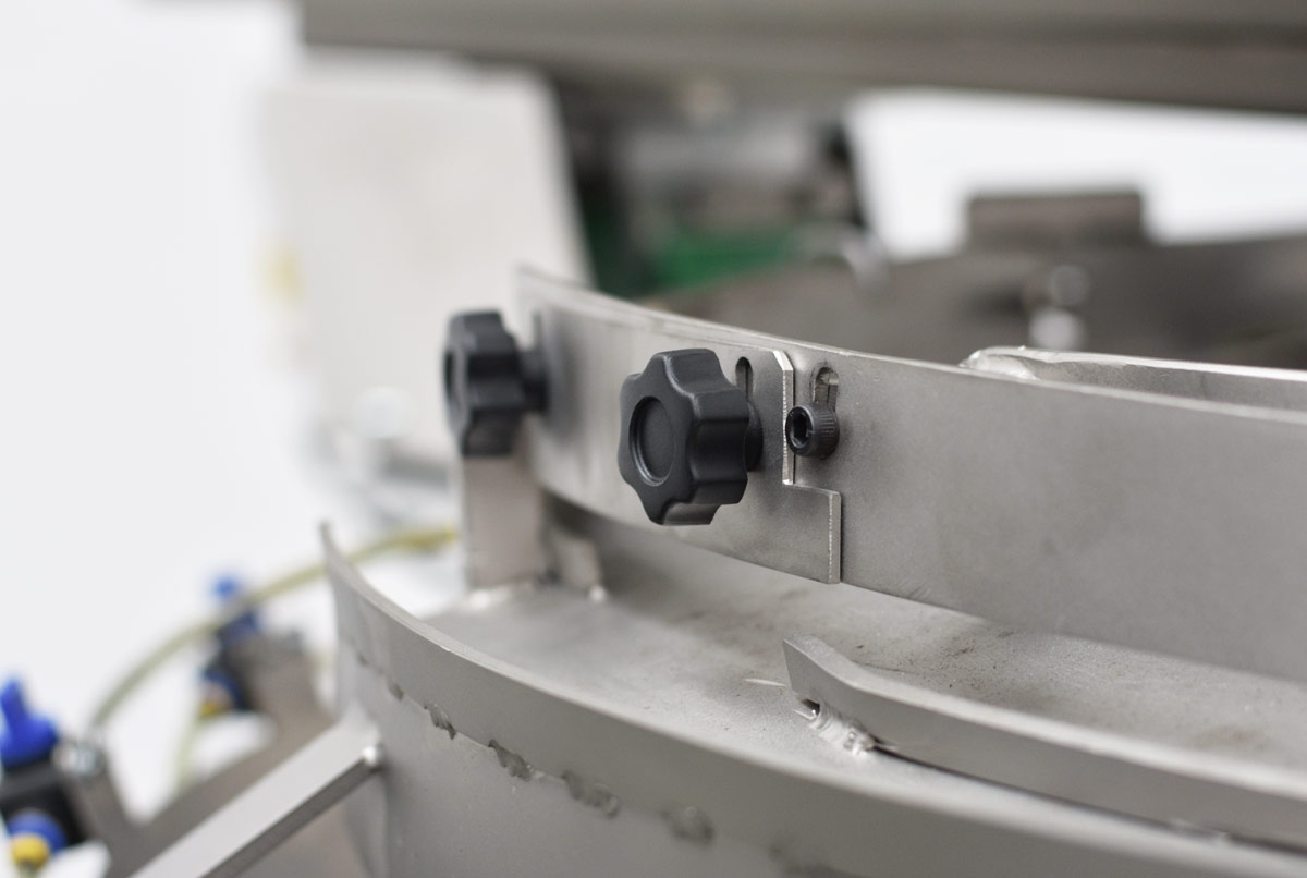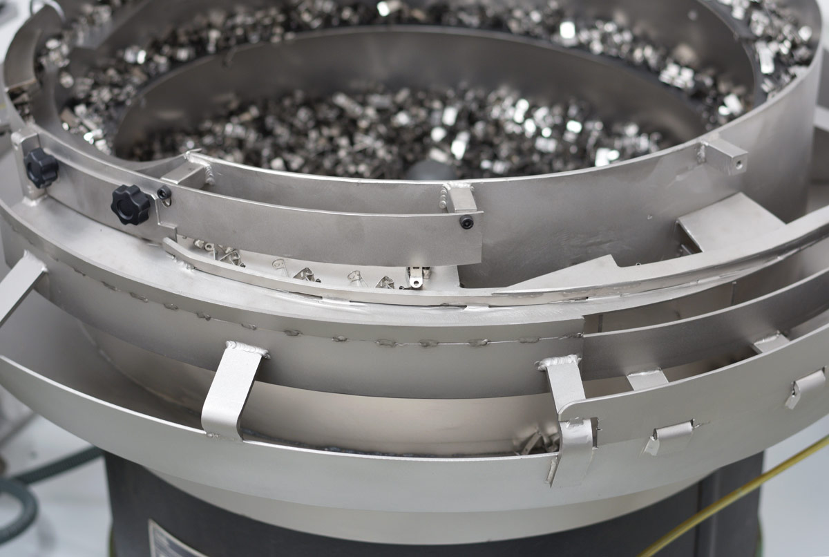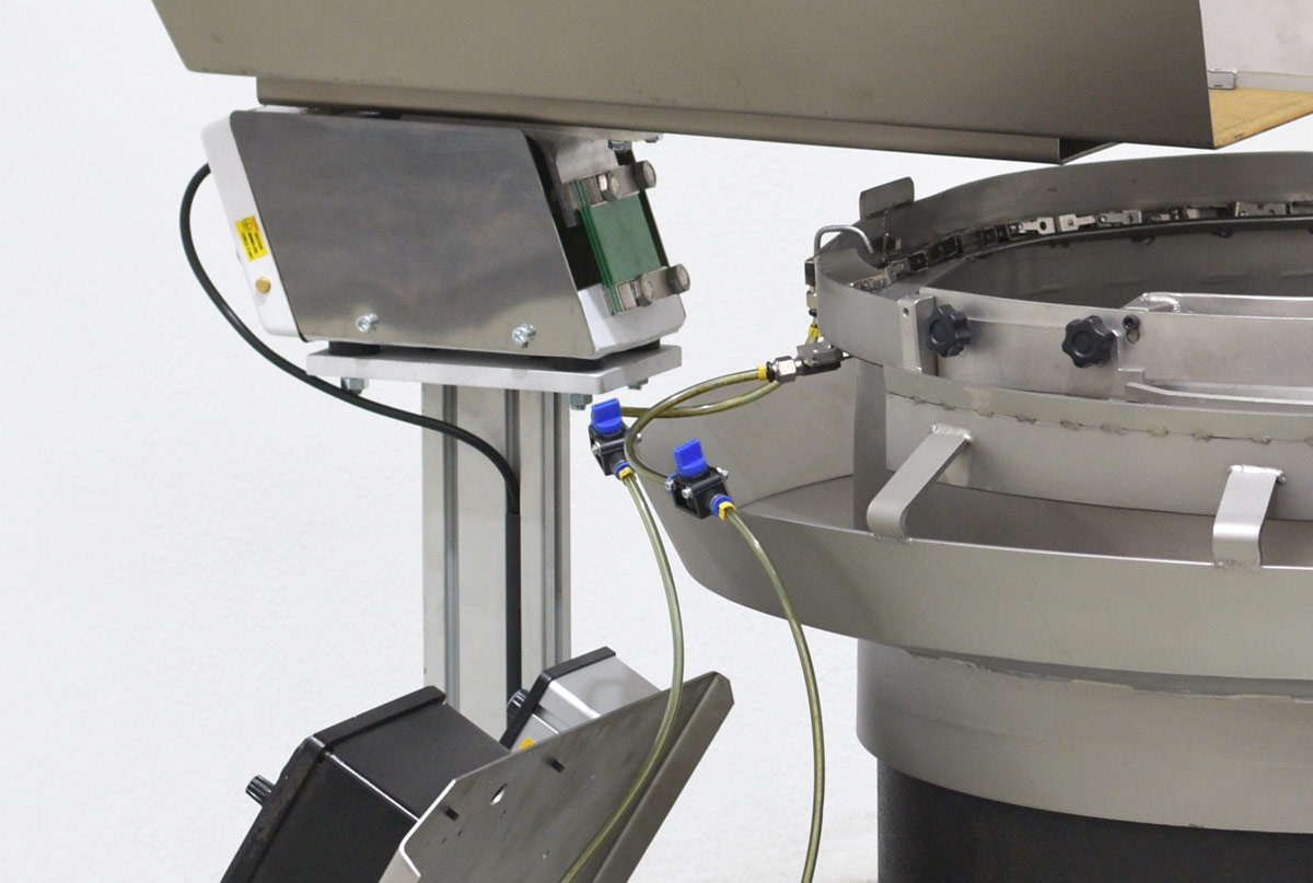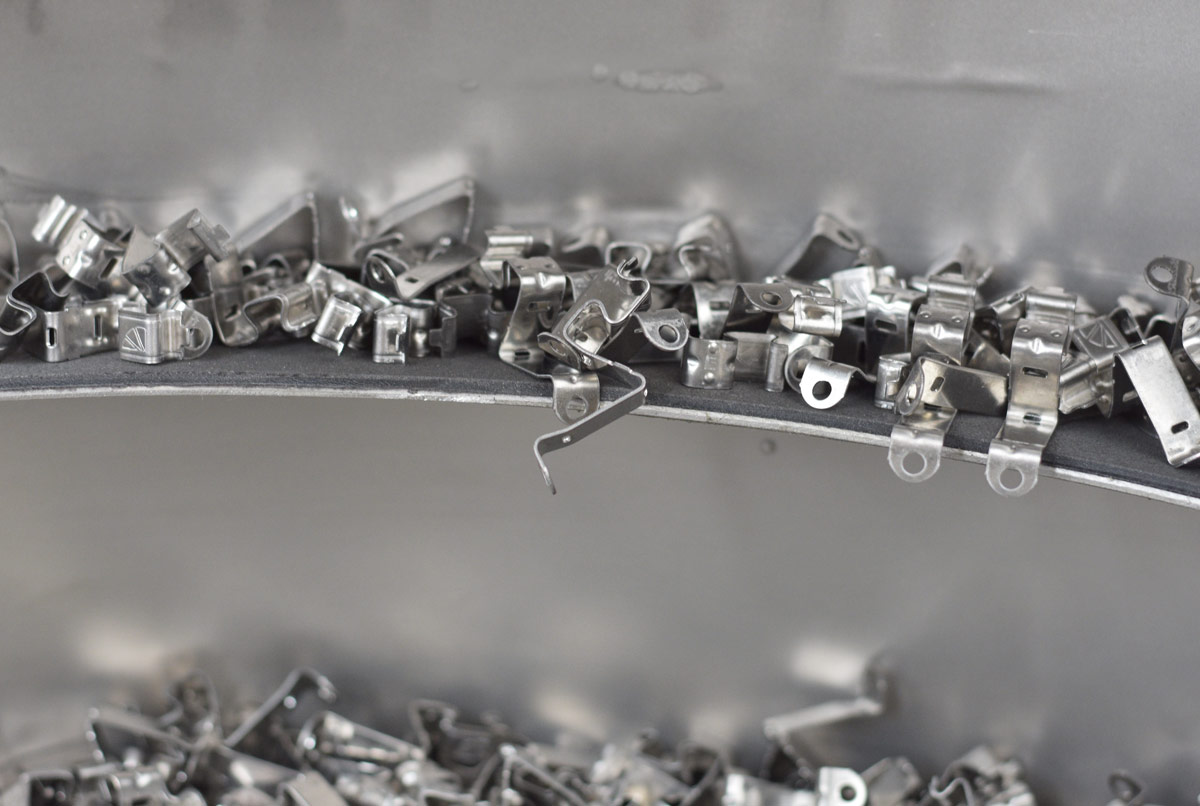 La máquina pertenece a un fabricante de muelles, como estos, denominados flejes. Tras abandonar la unidad de plegado, los flejes necesitan ser supervisados para asegurar su correcta fabricación. En este proceso de control de calidad, las piezas deben entrar en el plato de visión bajo varias premisas: de una en una, separadas y en posición horizontal; se trata de que la cámara de visión pueda hacer capturas y determinar si cada pieza está en condición óptima o defectuosa.