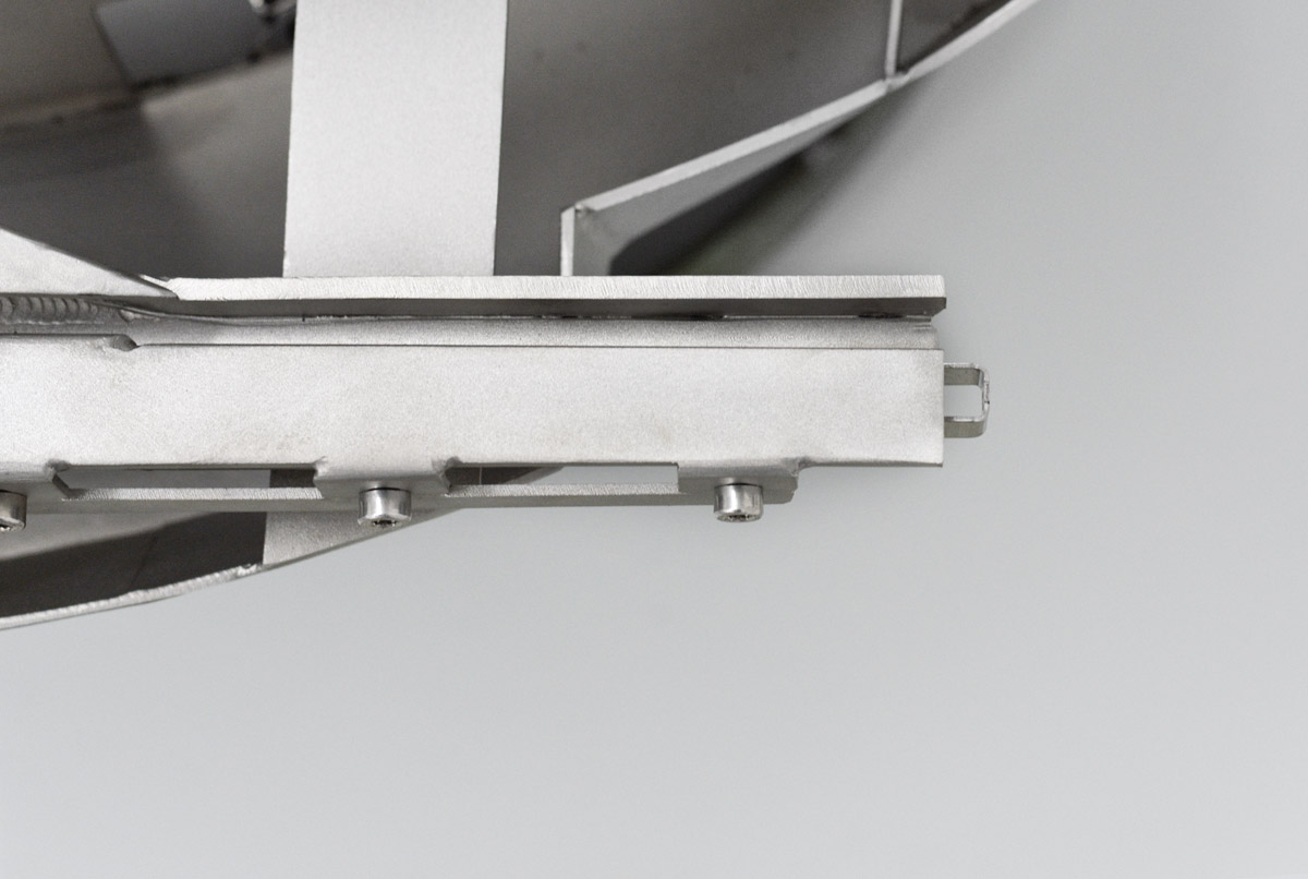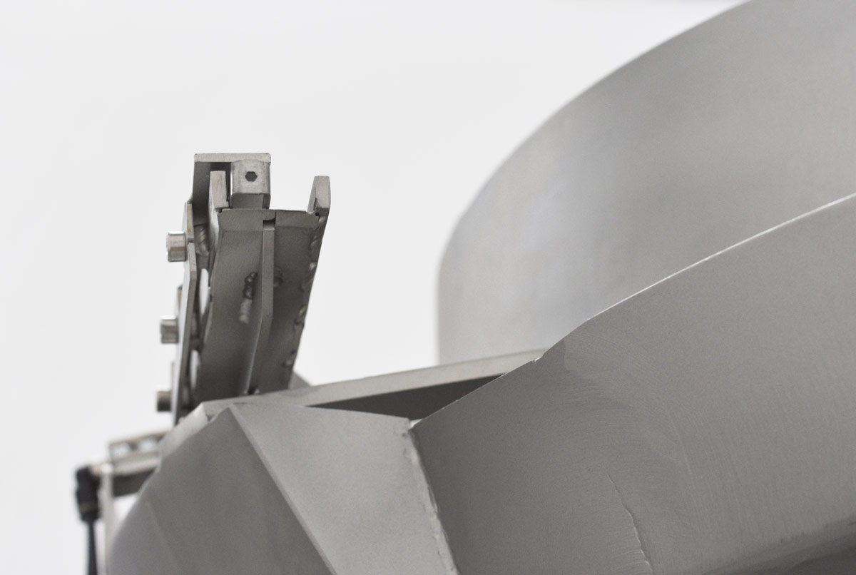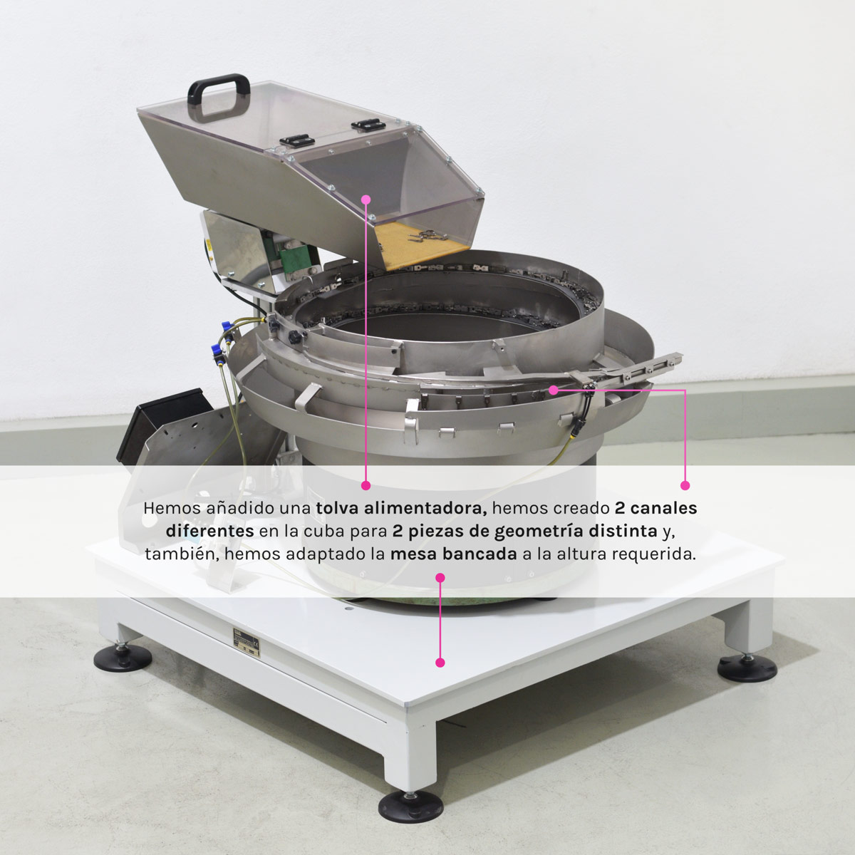 Esta reconversión nos llevó a varias prácticas funcionales y de acabado final: ampliar el sistema con una tolva de autonomía, modificar el bastidor hasta conseguir la altura precisa además de la sustitución de las patas y el acabado de pintura, sumados a la reparación y adaptación de la cuba de origen para que pueda trabajar con 2 tipos de piezas.